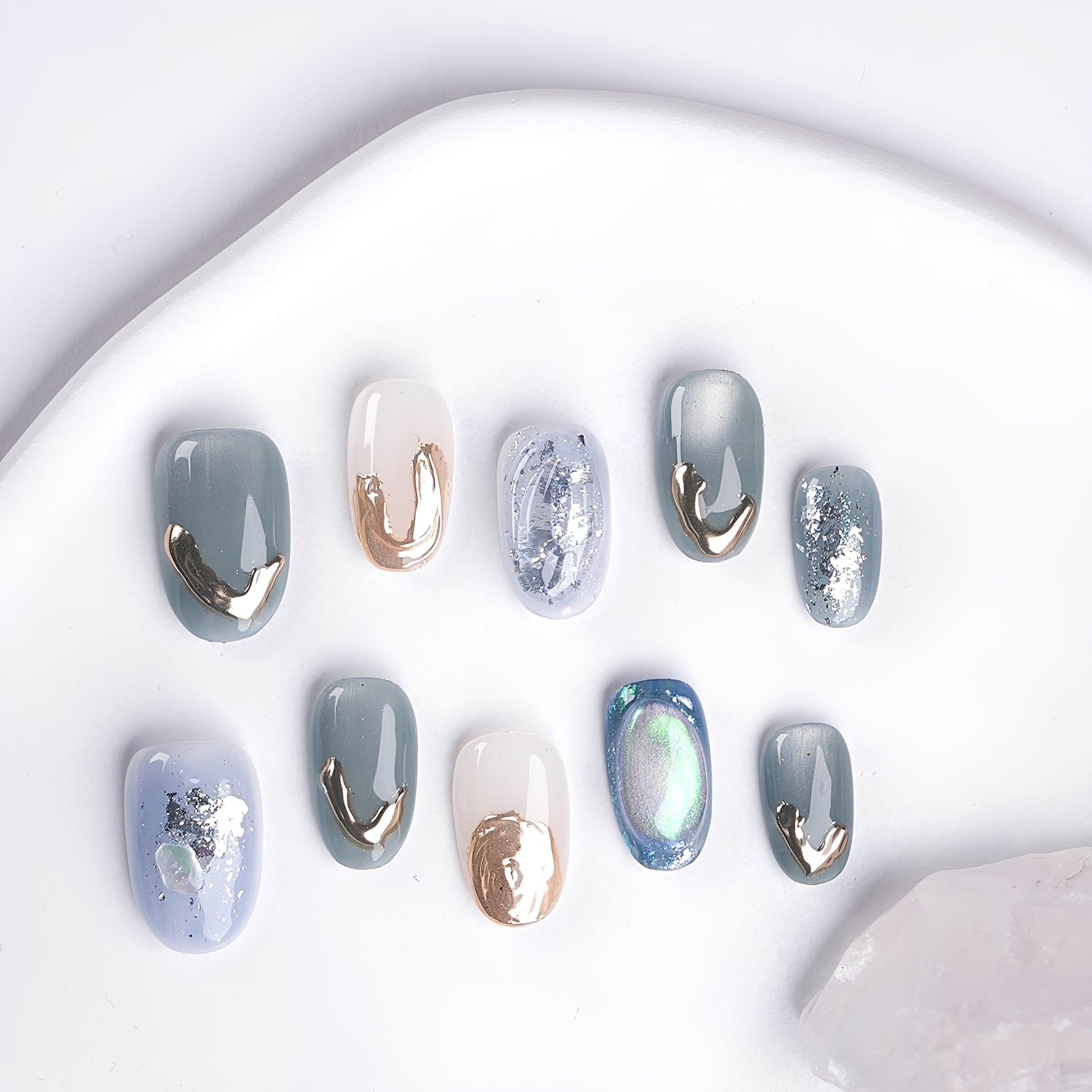 奥行きのあるオーロラニュアンスとメタリックなアクセントが、手元を一気に洗練された印象に仕上げます。