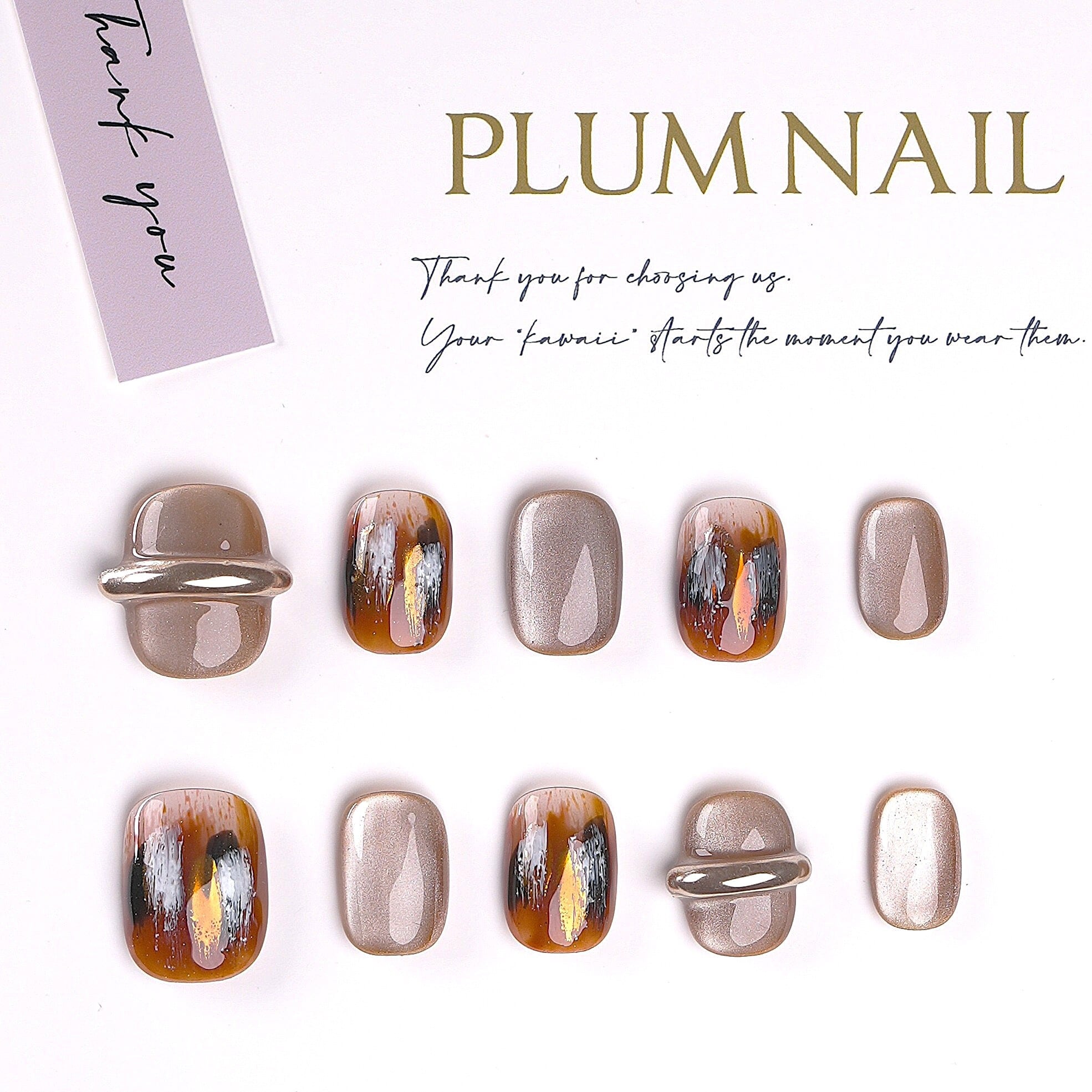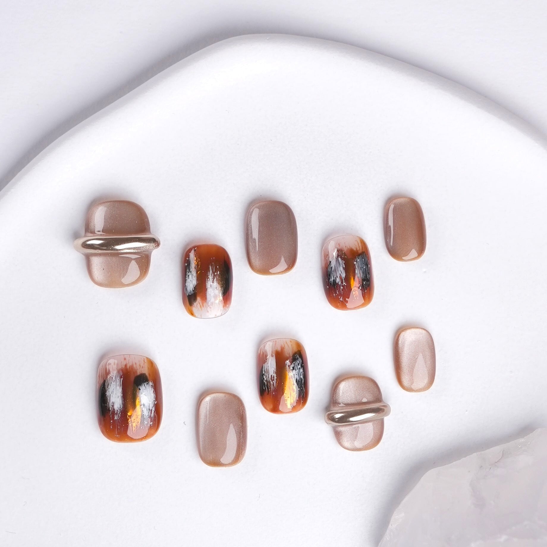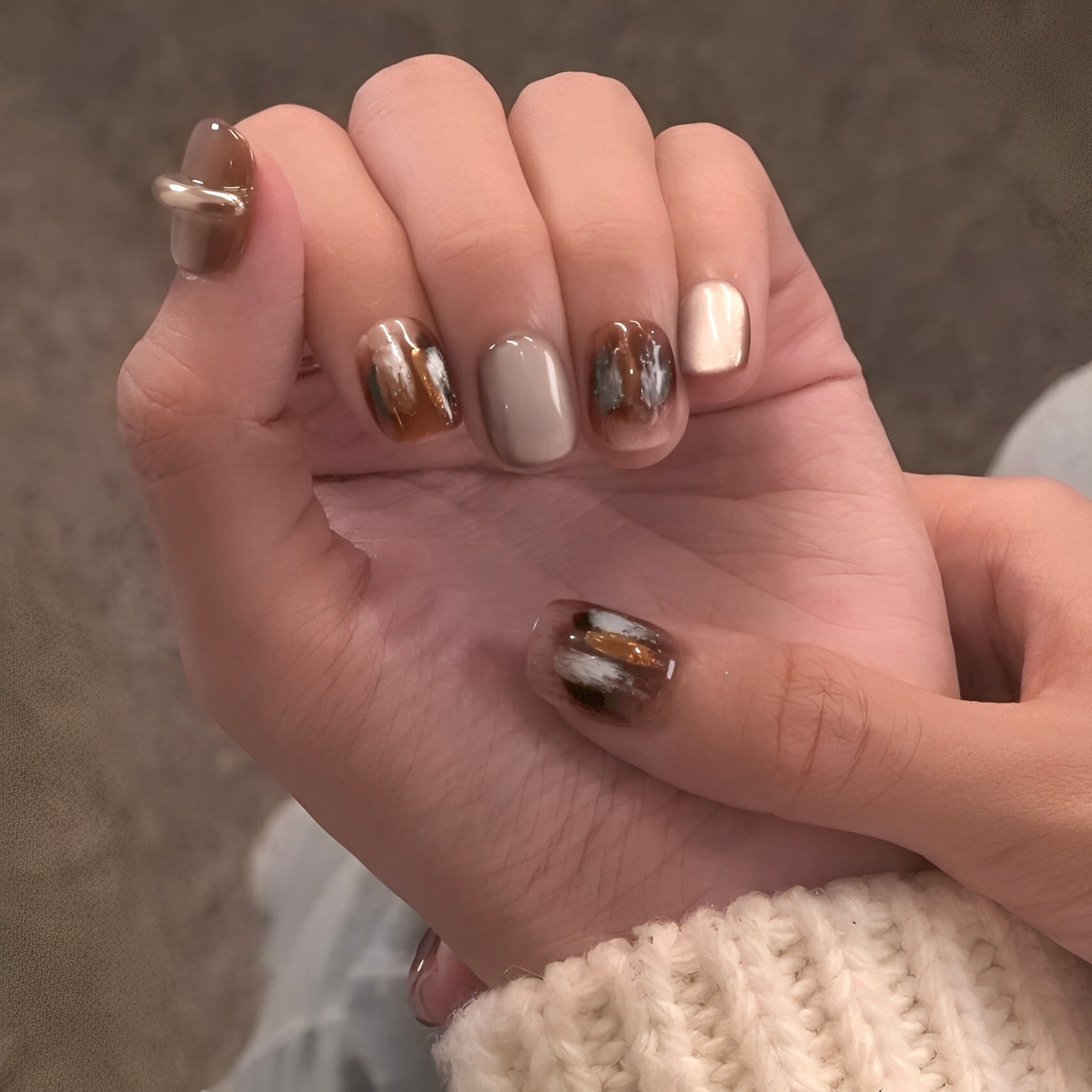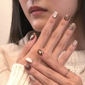 落ち着いたベージュをベースに、ブラウンとホワイトのニュアンスアートを重ねた大人モードなデザイン。光を受けてきらめくゴールドアクセントが、指先に高級感と抜け感をプラスします。