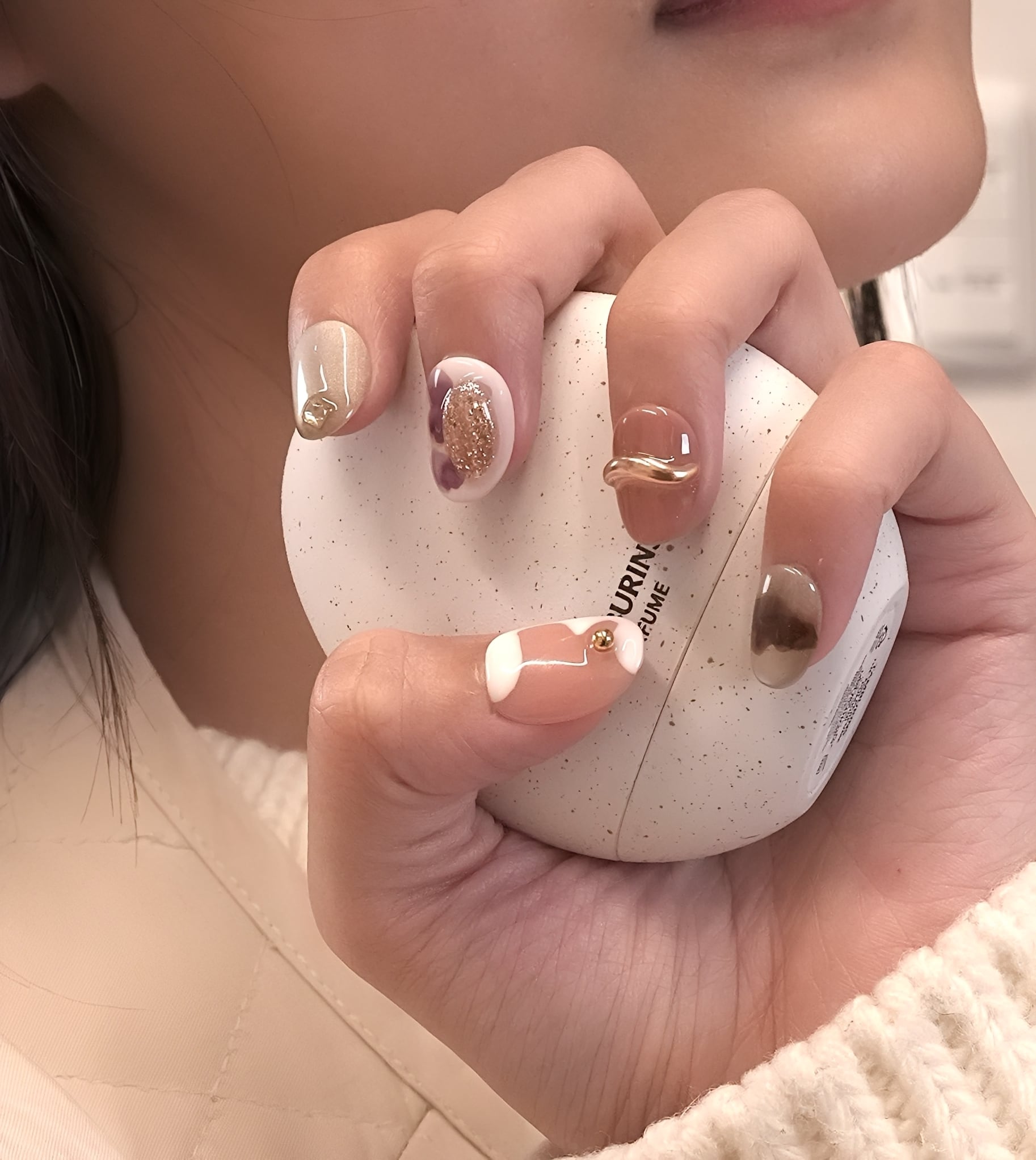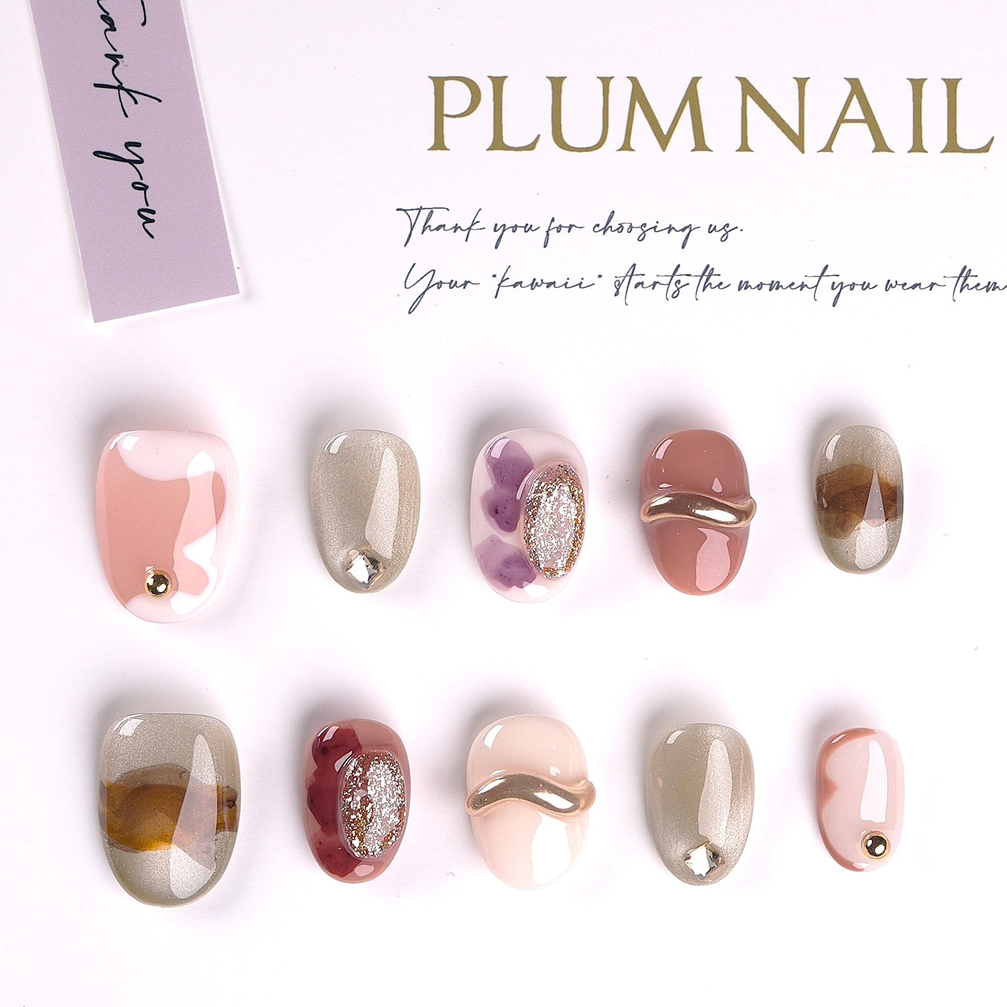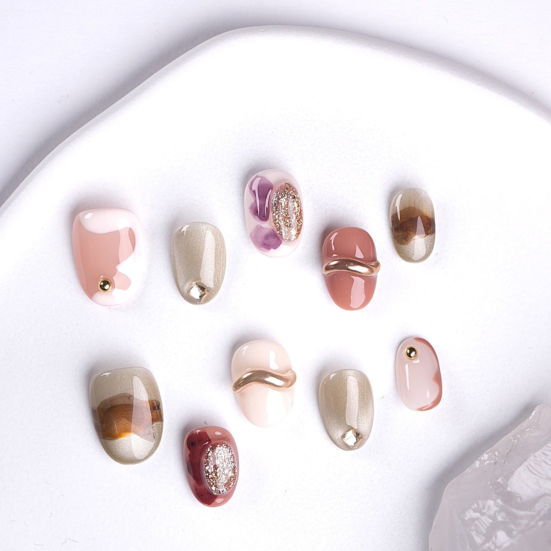 ブラウンやベージュを基調に、ゴールドラメやメタルパーツを散りばめた華やかなニュアンスデザイン。