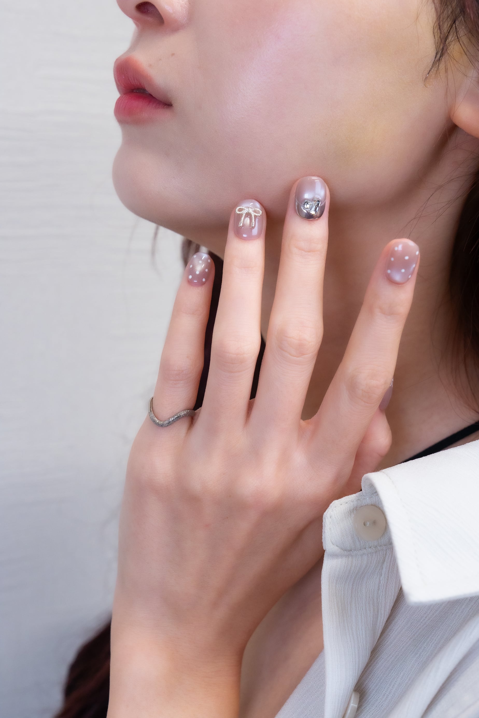 透明感のあるピンクベージュカラーに、繊細なリボンアートと立体モチーフをあしらったデザイン。