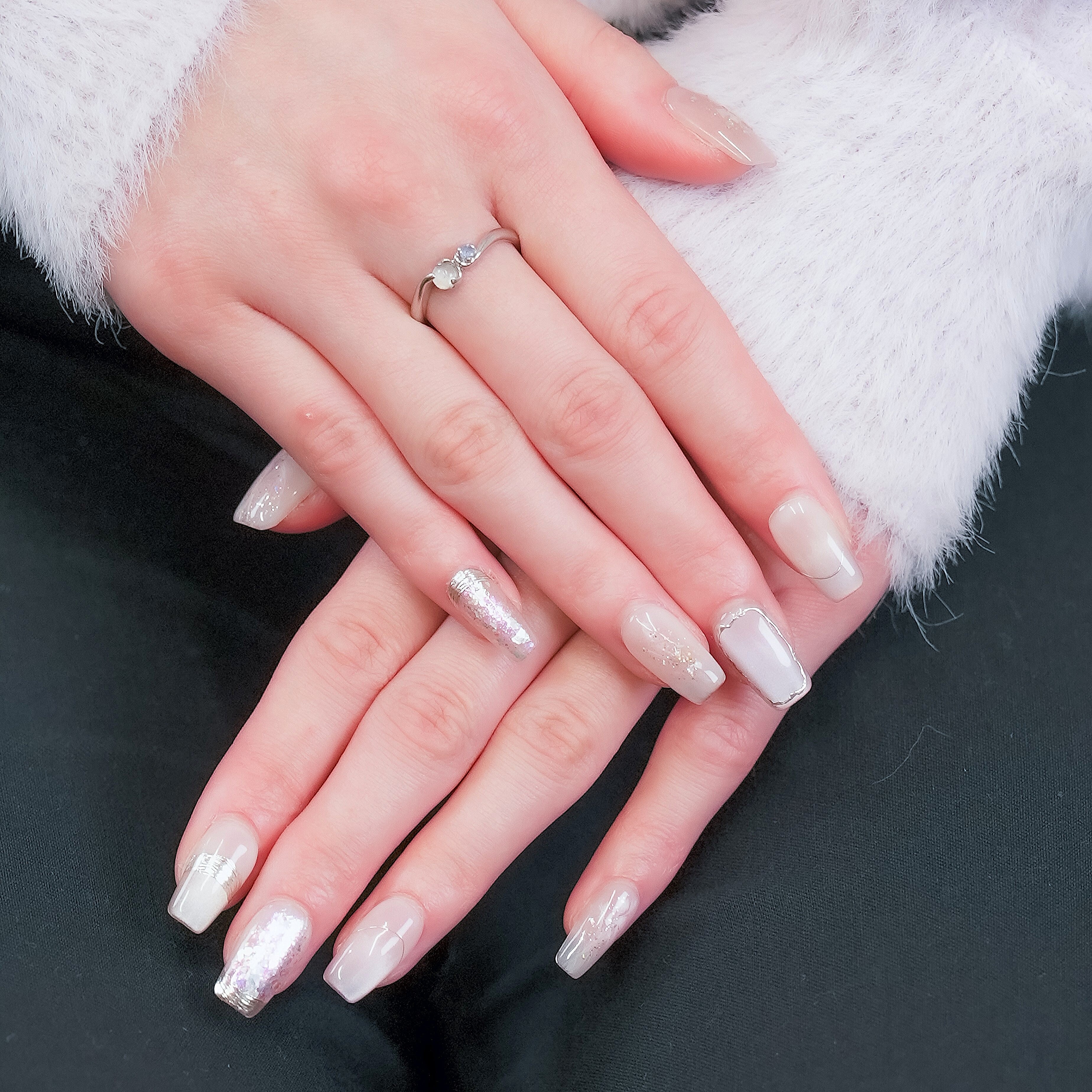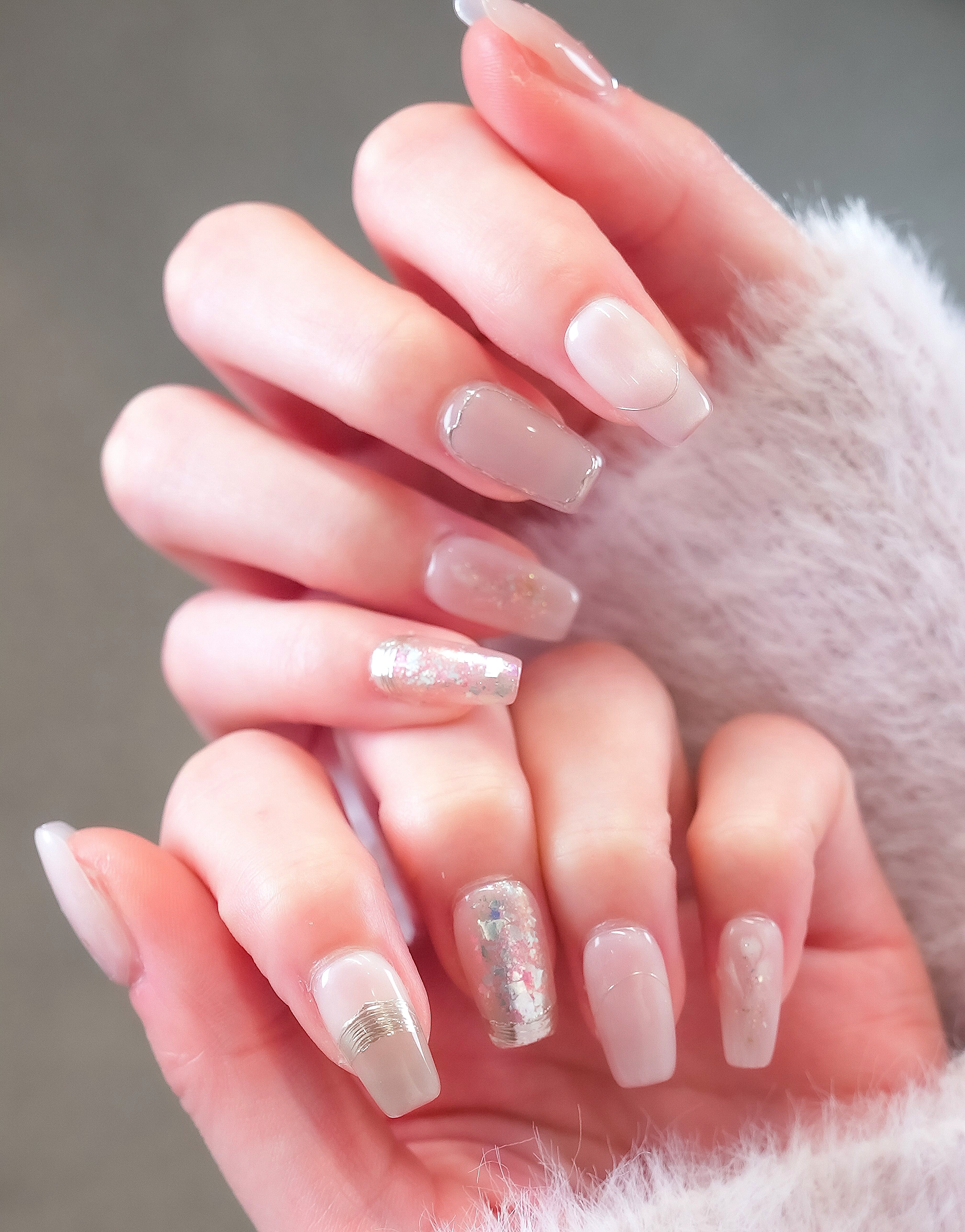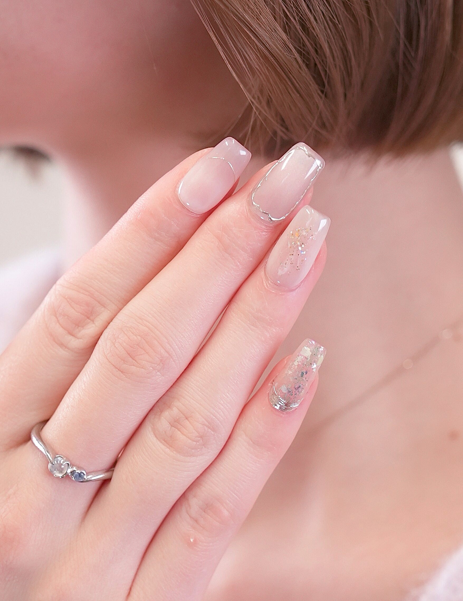 くすみグレージュにオーロラフレークを重ねた、上品で抜け感のあるニュアンスデザイン。