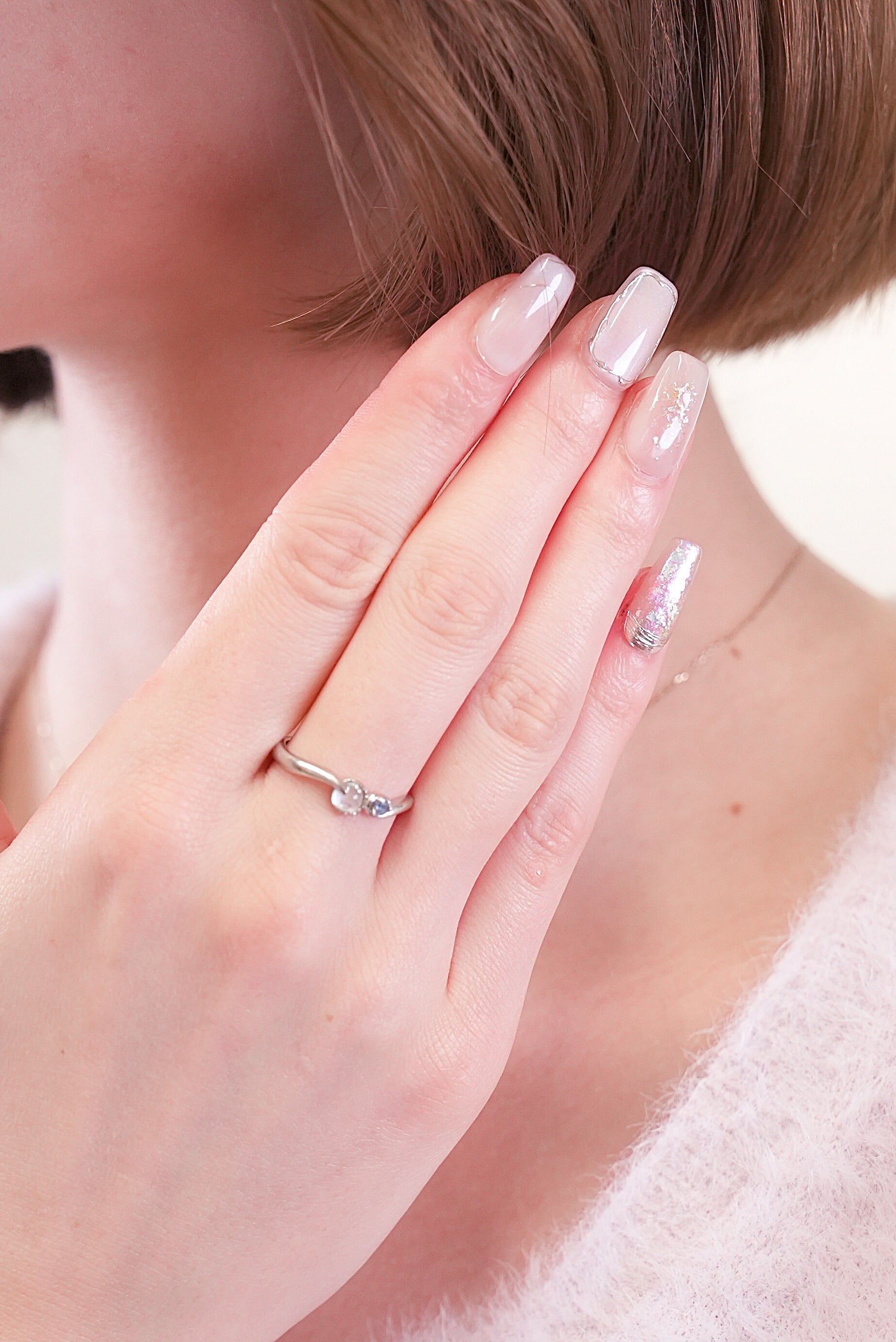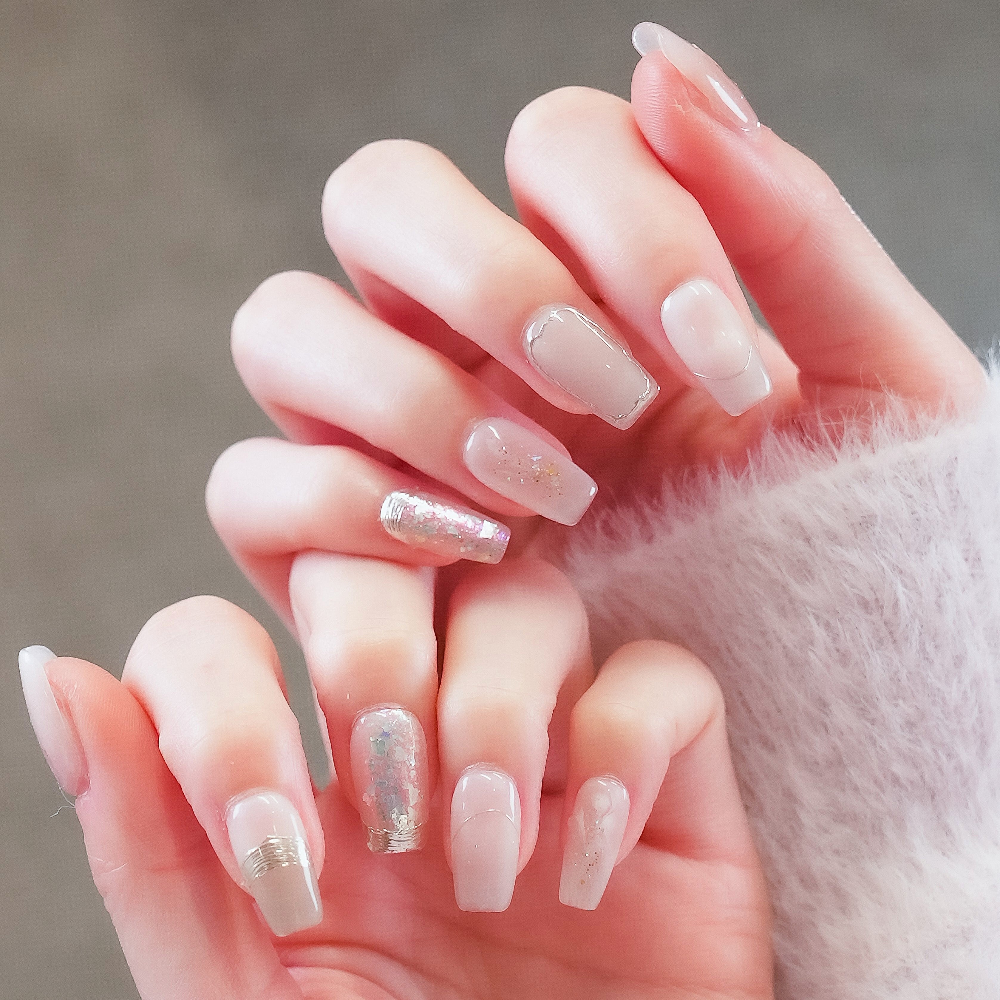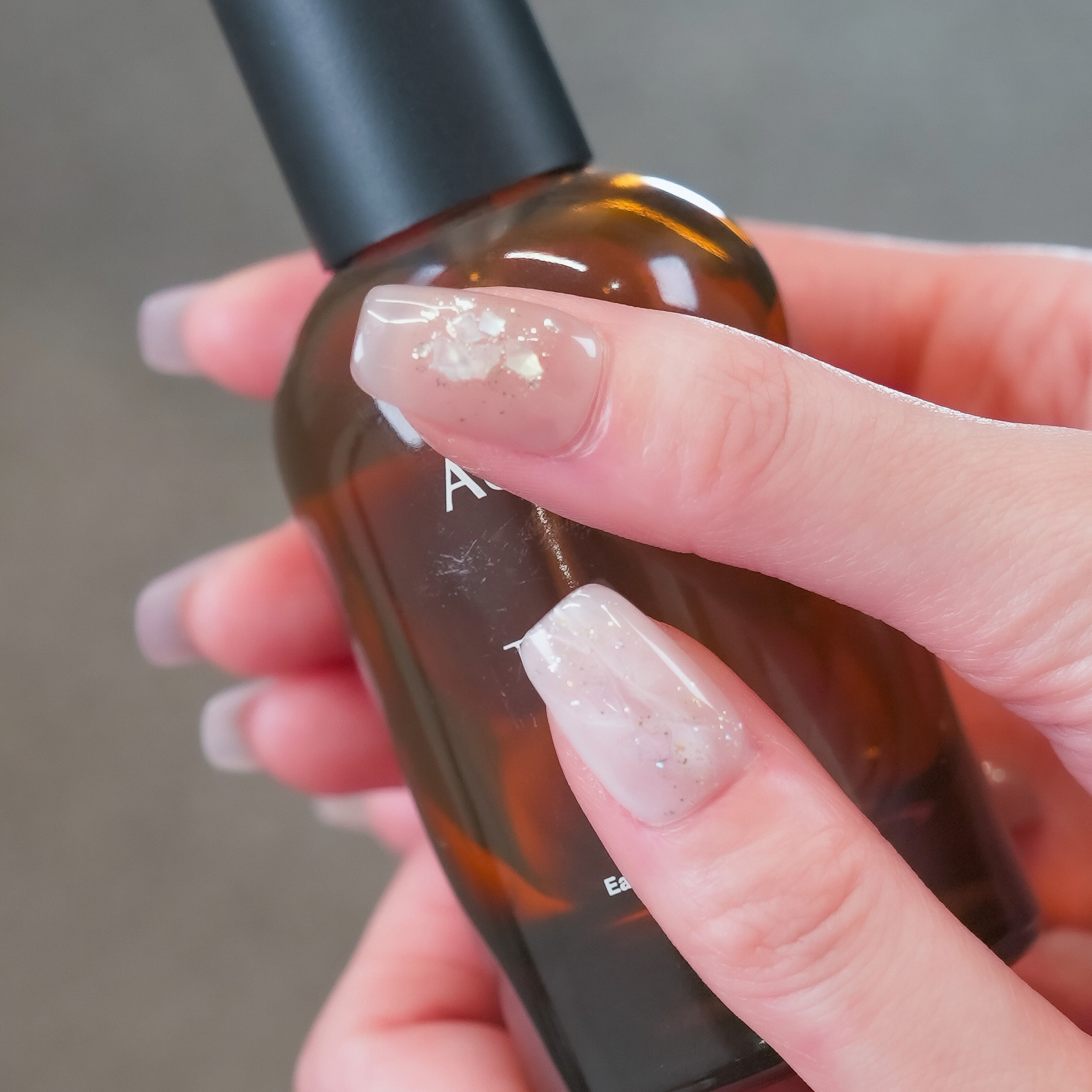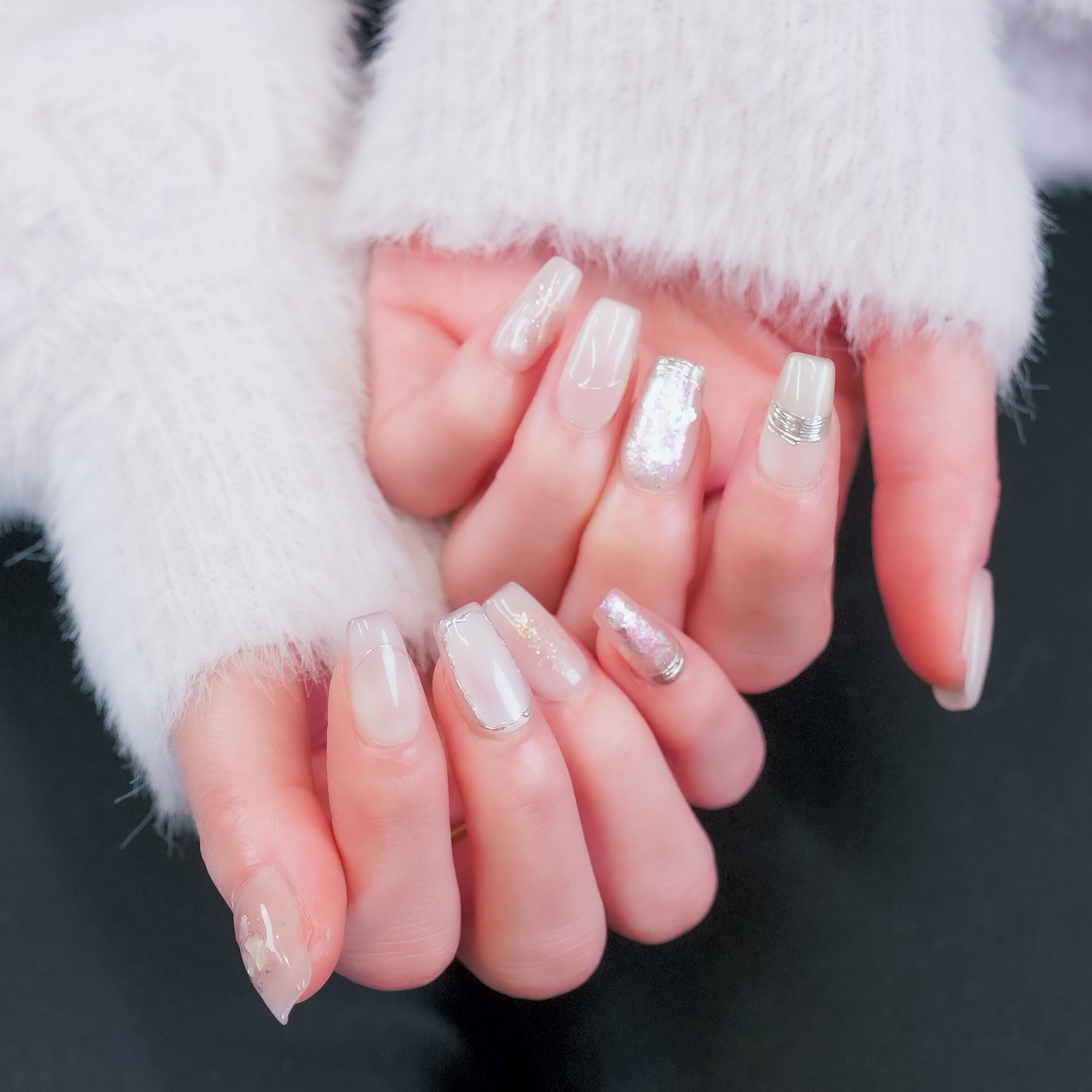 くすみグレージュにオーロラフレークを重ねた、上品で抜け感のあるニュアンスデザイン。