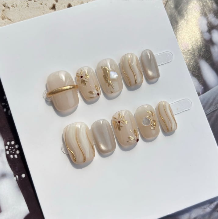 温かみのあるアイボリーグレージュに、繊細なゴールドラインとリーフアートをあしらったエレガントデザイン。