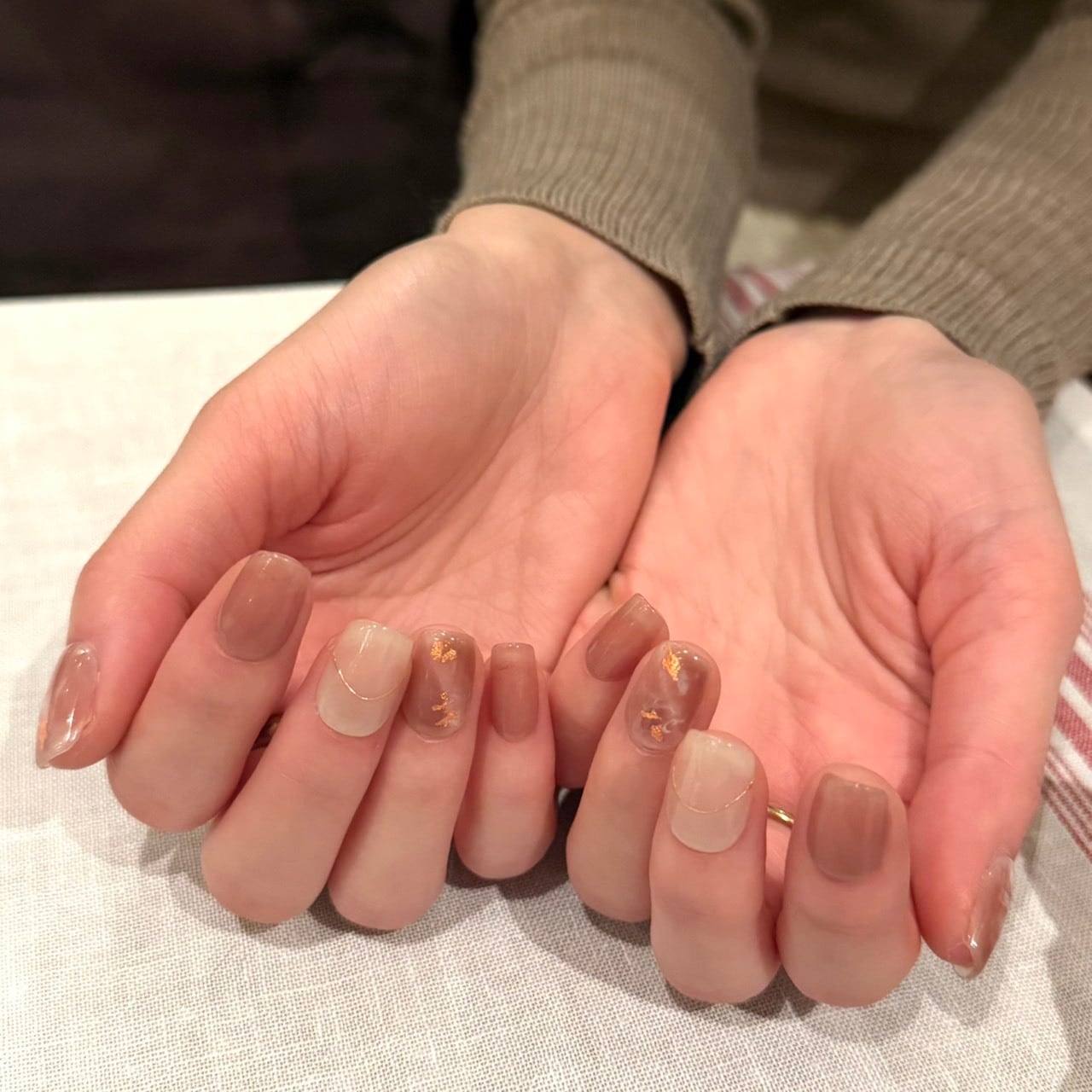 ほんのり透け感のあるキャラメルブラウンに、ゴールドのフレークがやさしくきらめく秋冬限定デザイン。