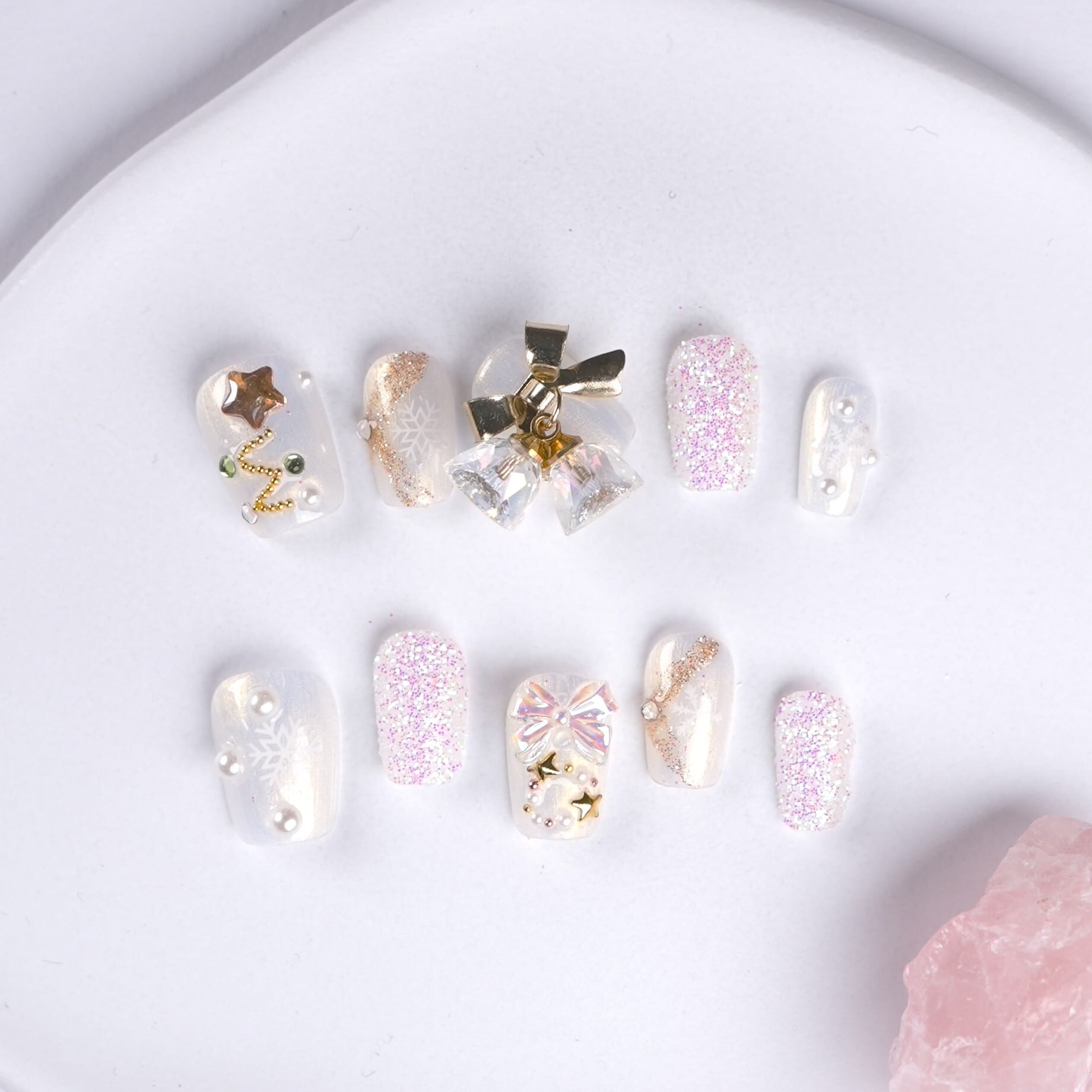透け感のあるホワイトをベースに、ゴールドベルや雪の結晶を散りばめた冬限定のデザイン。