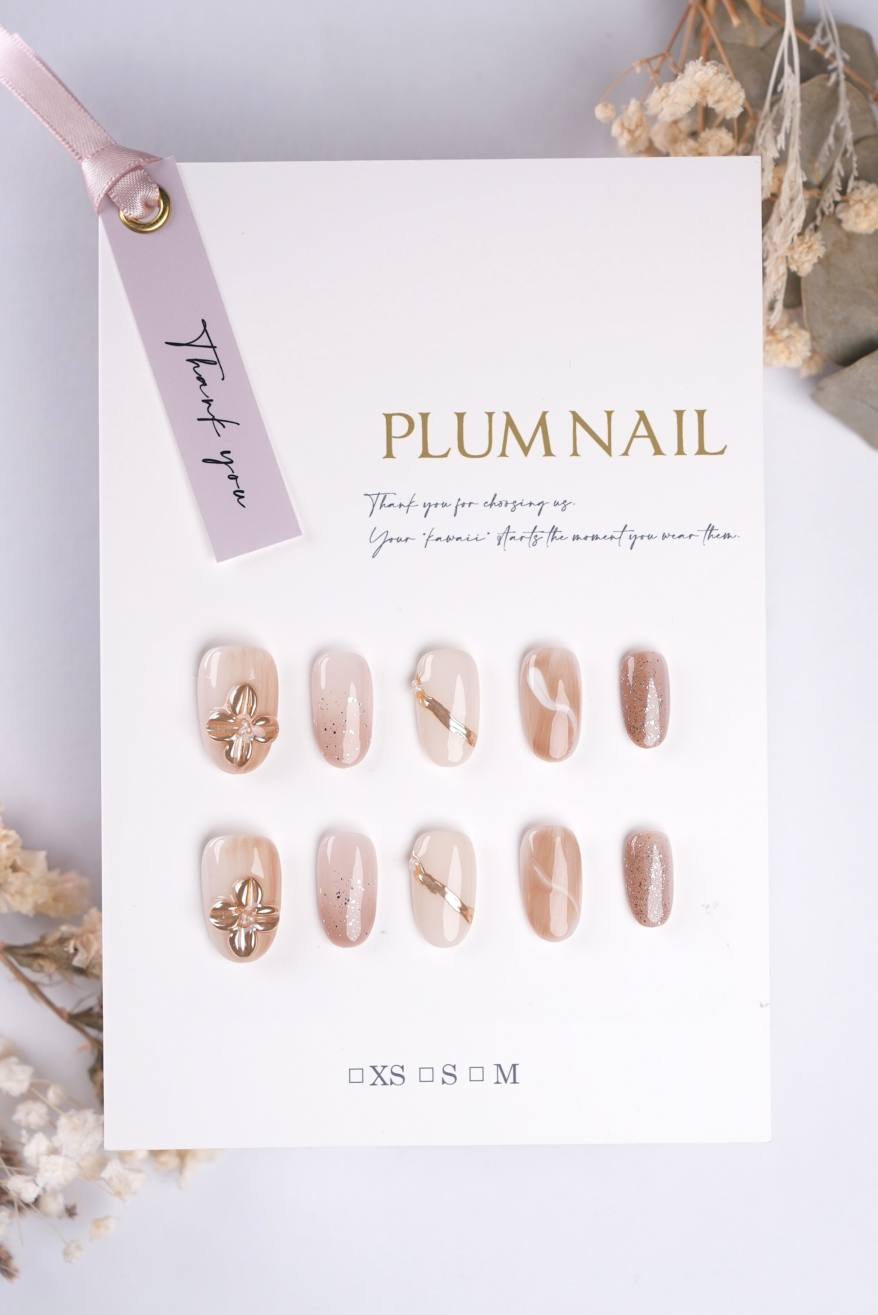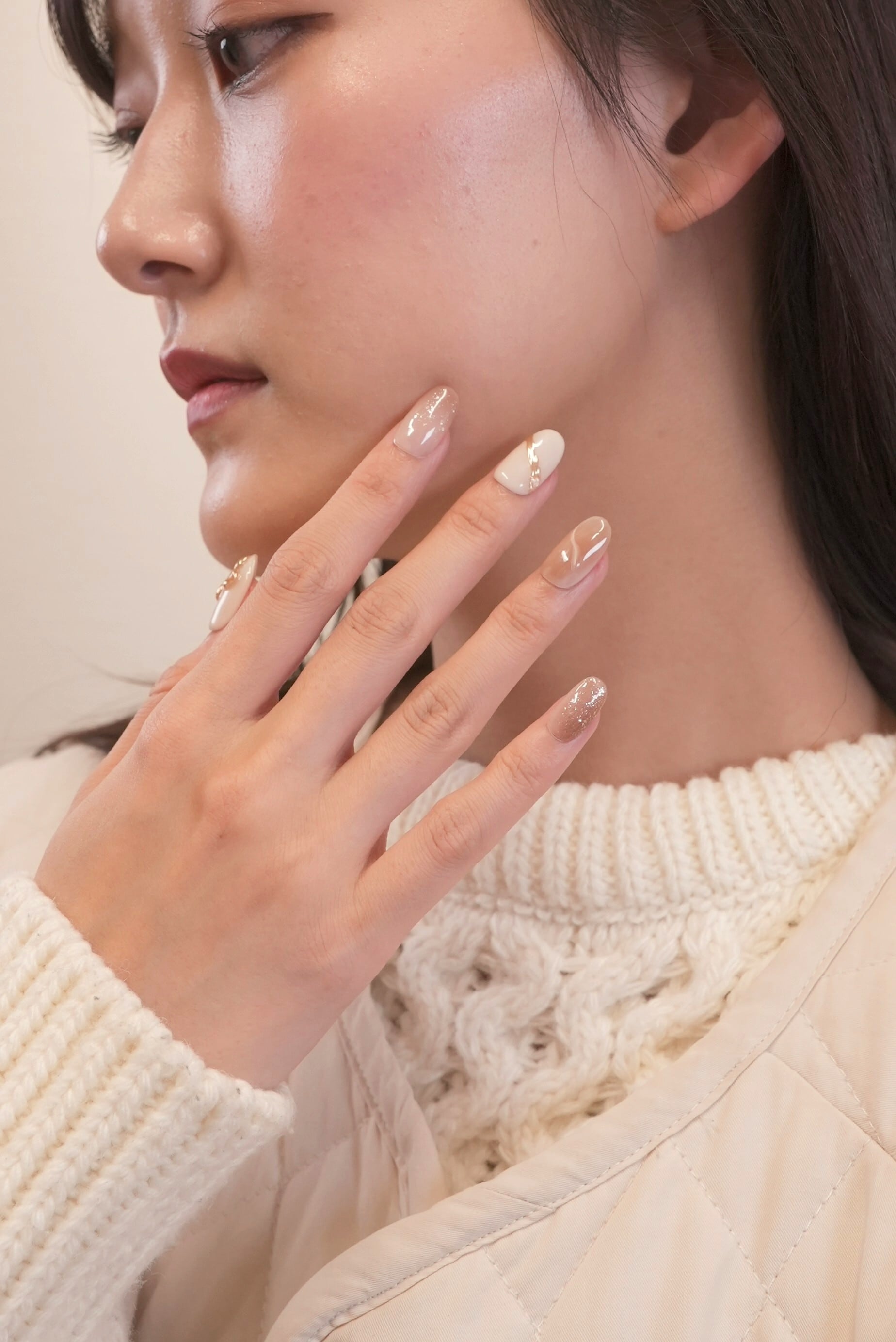 上品なベージュトーンをベースに、ニュアンスアートとゴールドアクセントを重ねた大人のためのネイルデザイン。