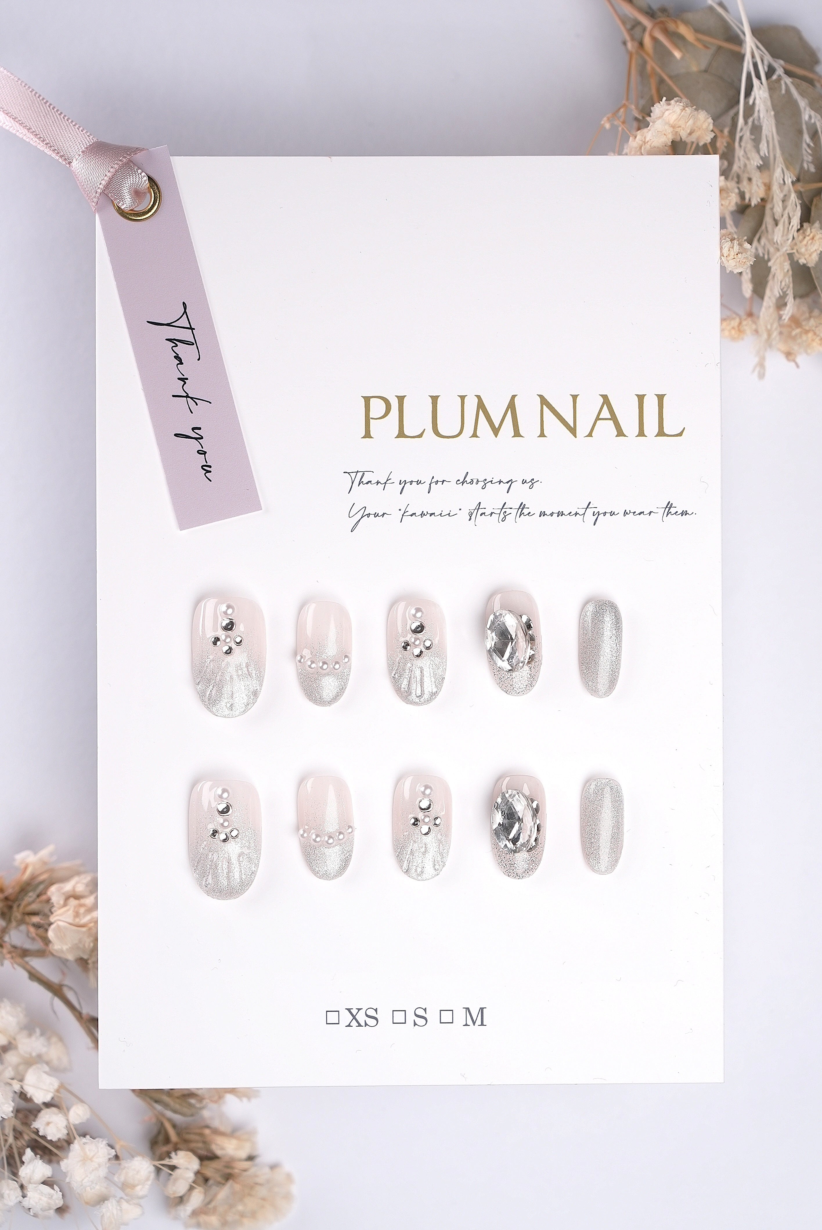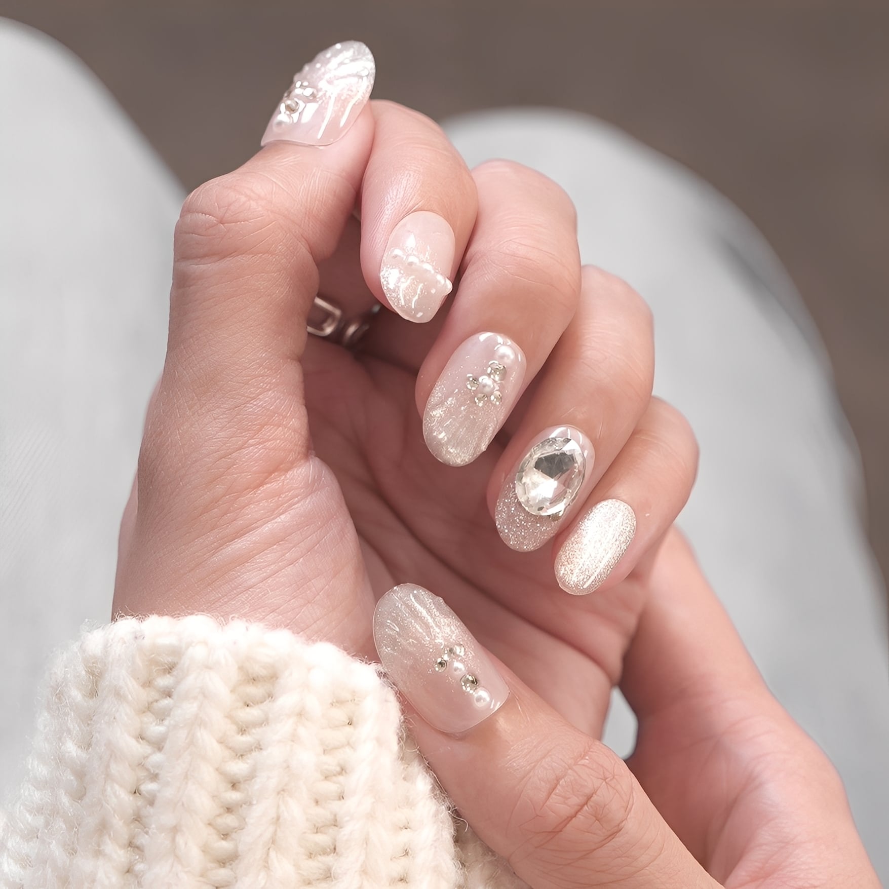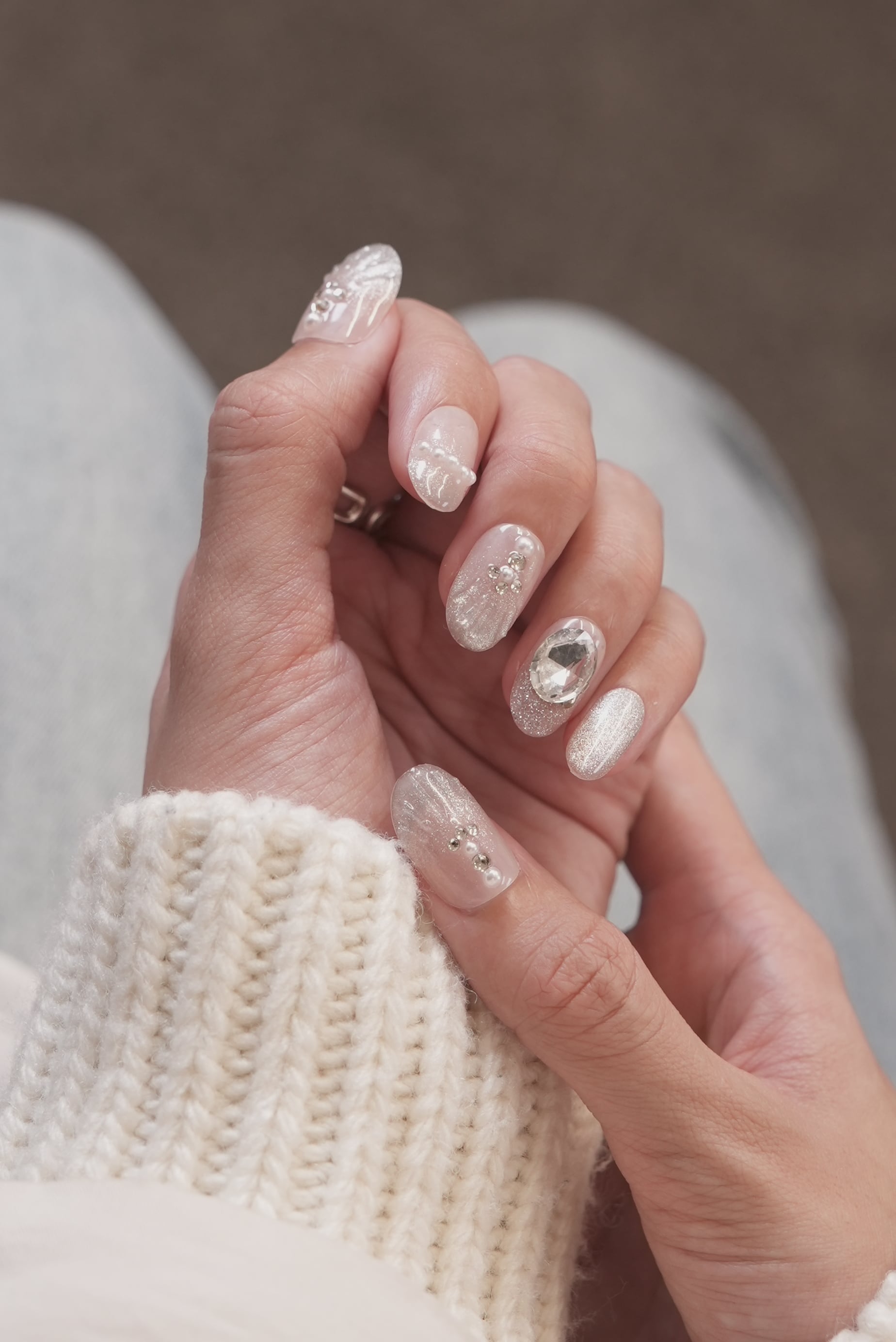 光を受けるたびに表情が変わる、清楚さときらめきを両立した大人のためのネイルデザインです。