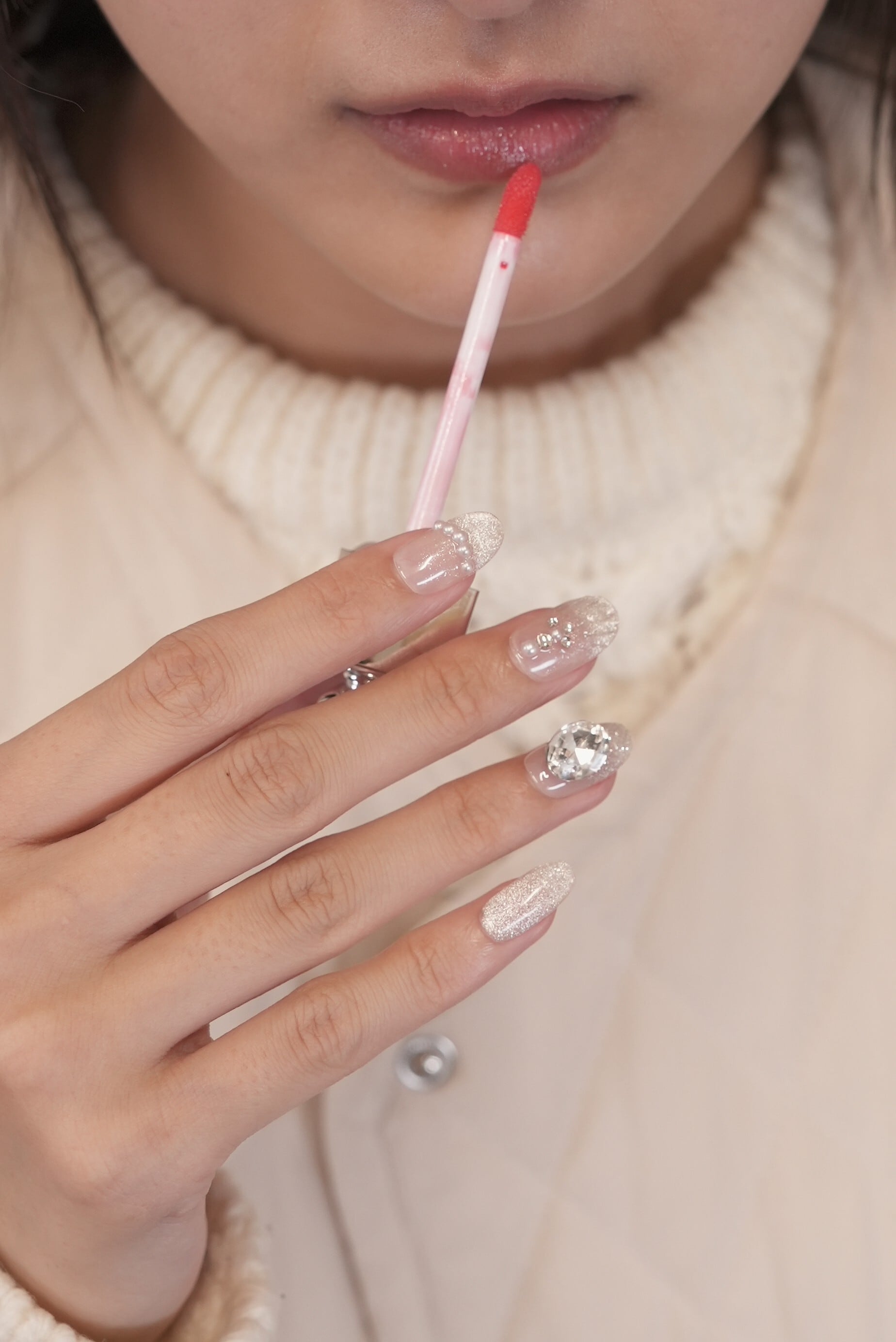 大粒ビジューをアクセントにしつつも、全体はやわらかく肌なじみの良いカラーでまとめているため、派手すぎず上品な印象に。