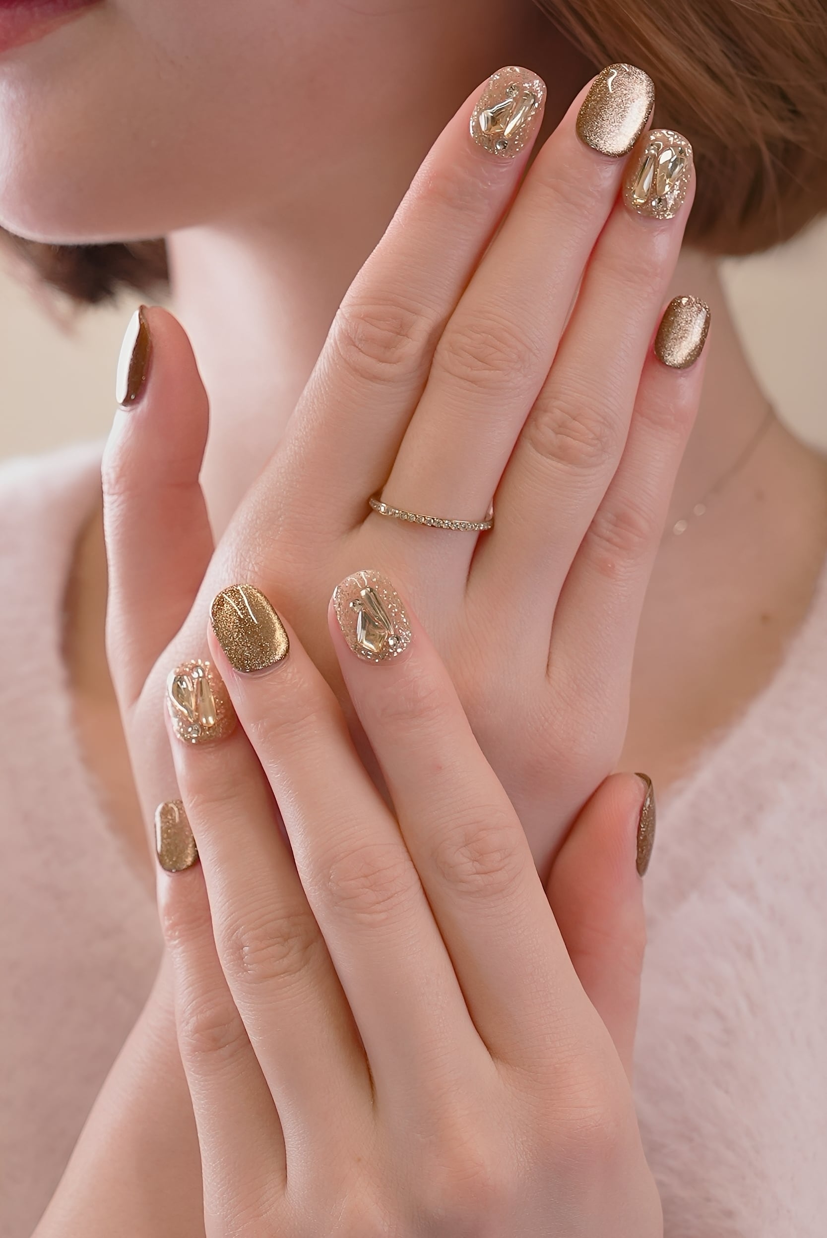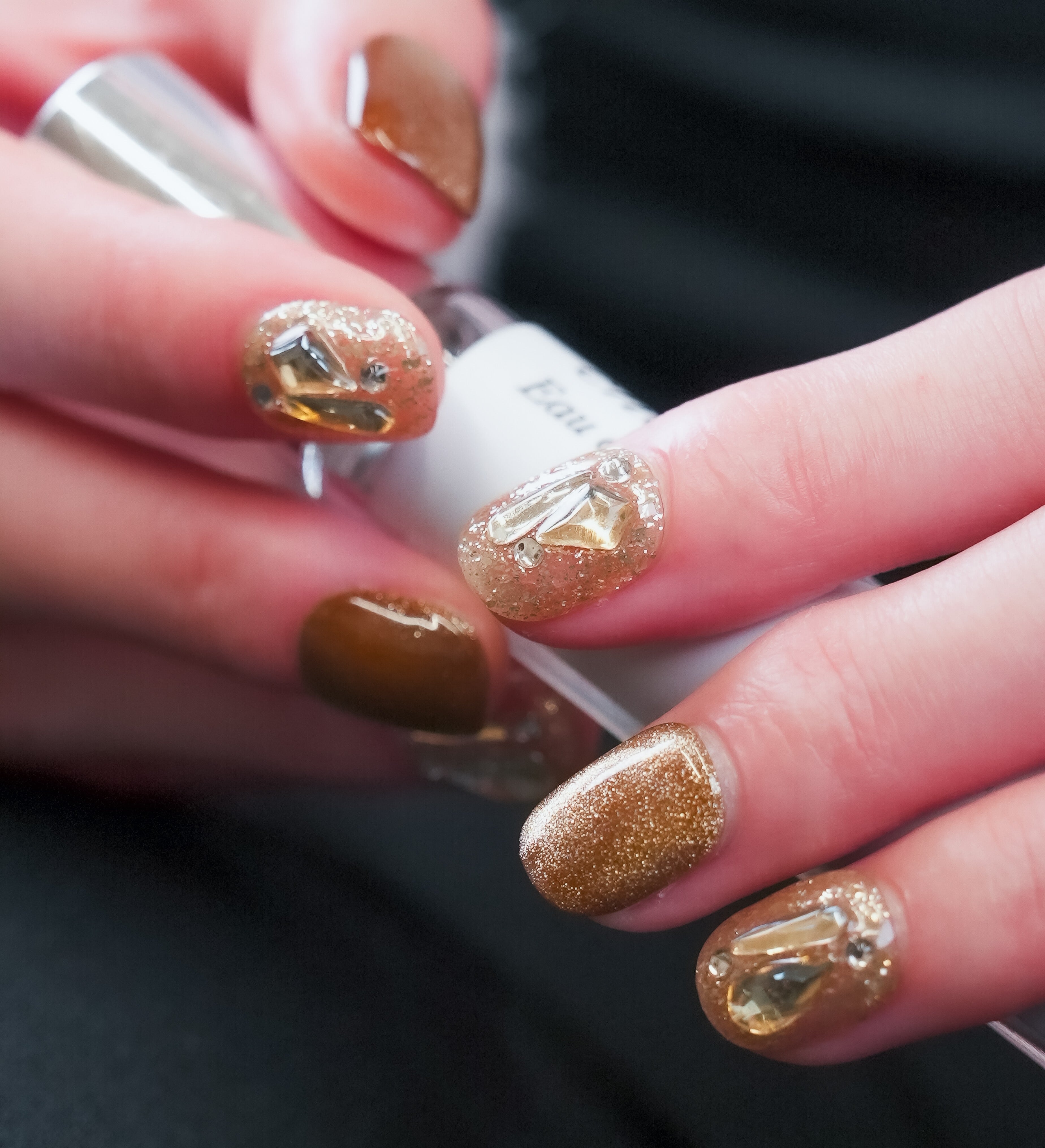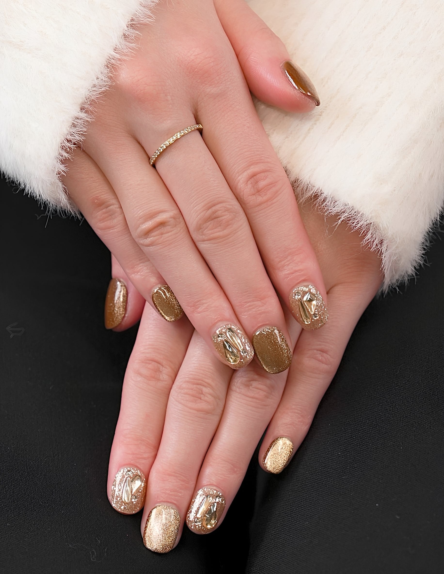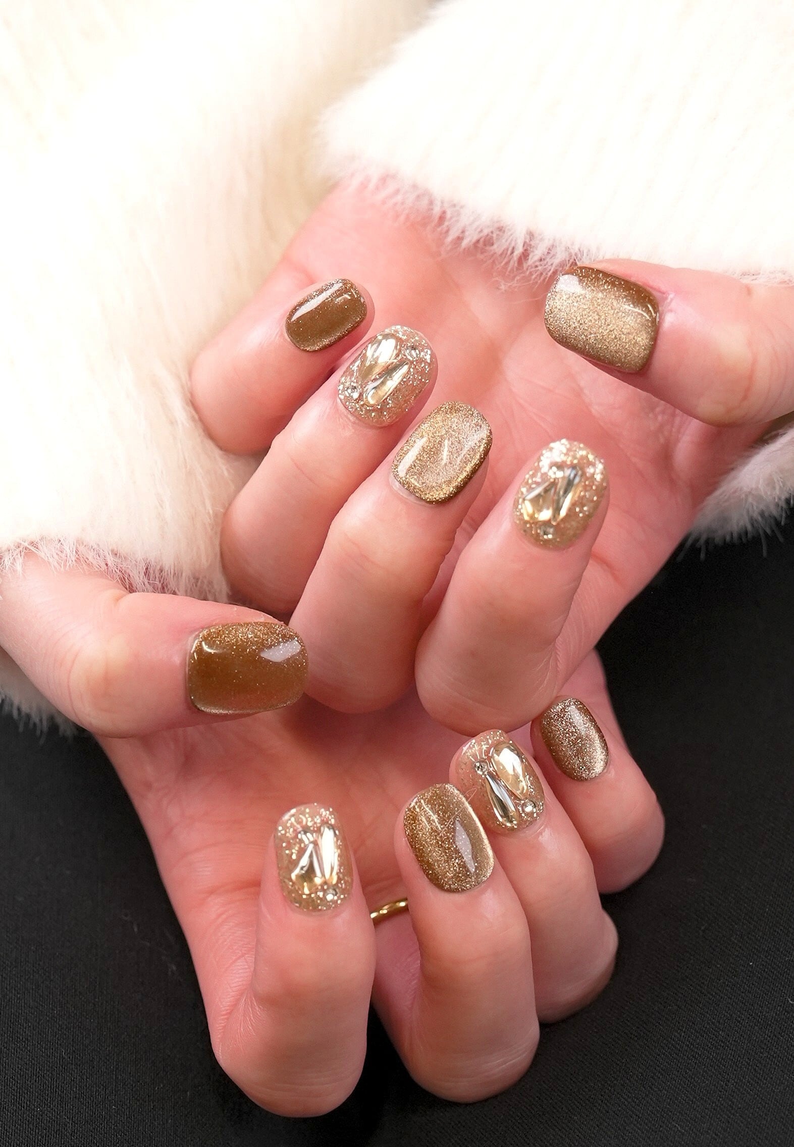 深みのあるゴールドブラウンラメと、クリアベースに閉じ込めたメタリックパーツを組み合わせた洗練ニュアンスネイル。