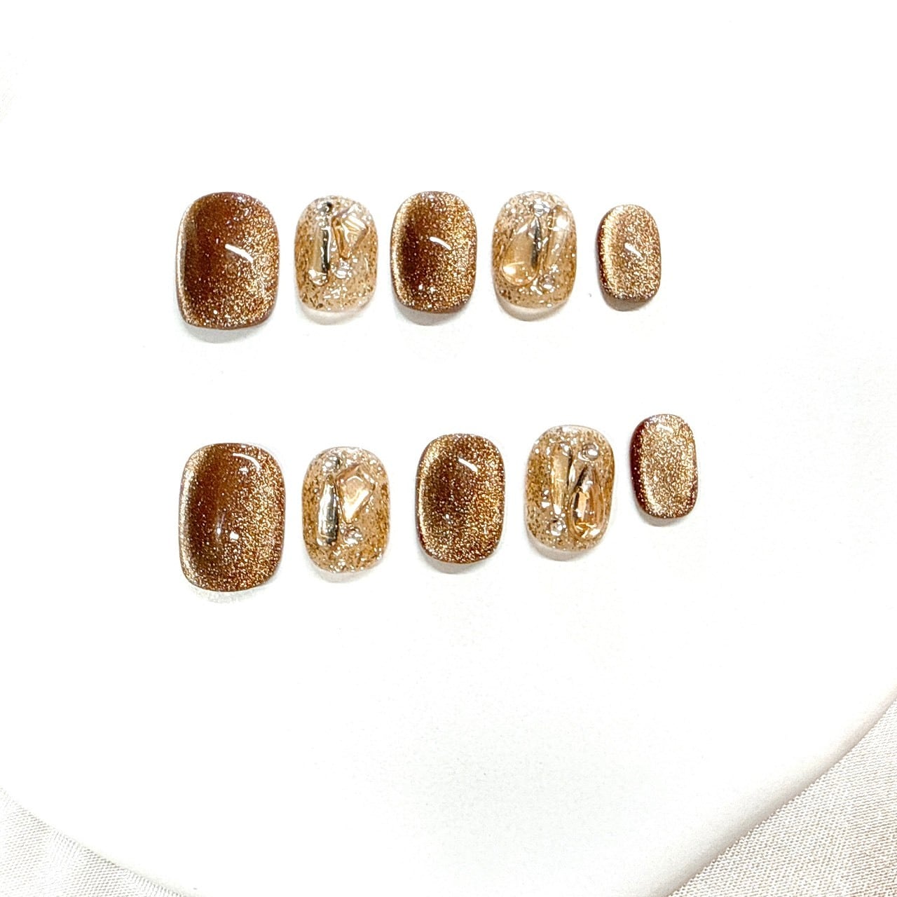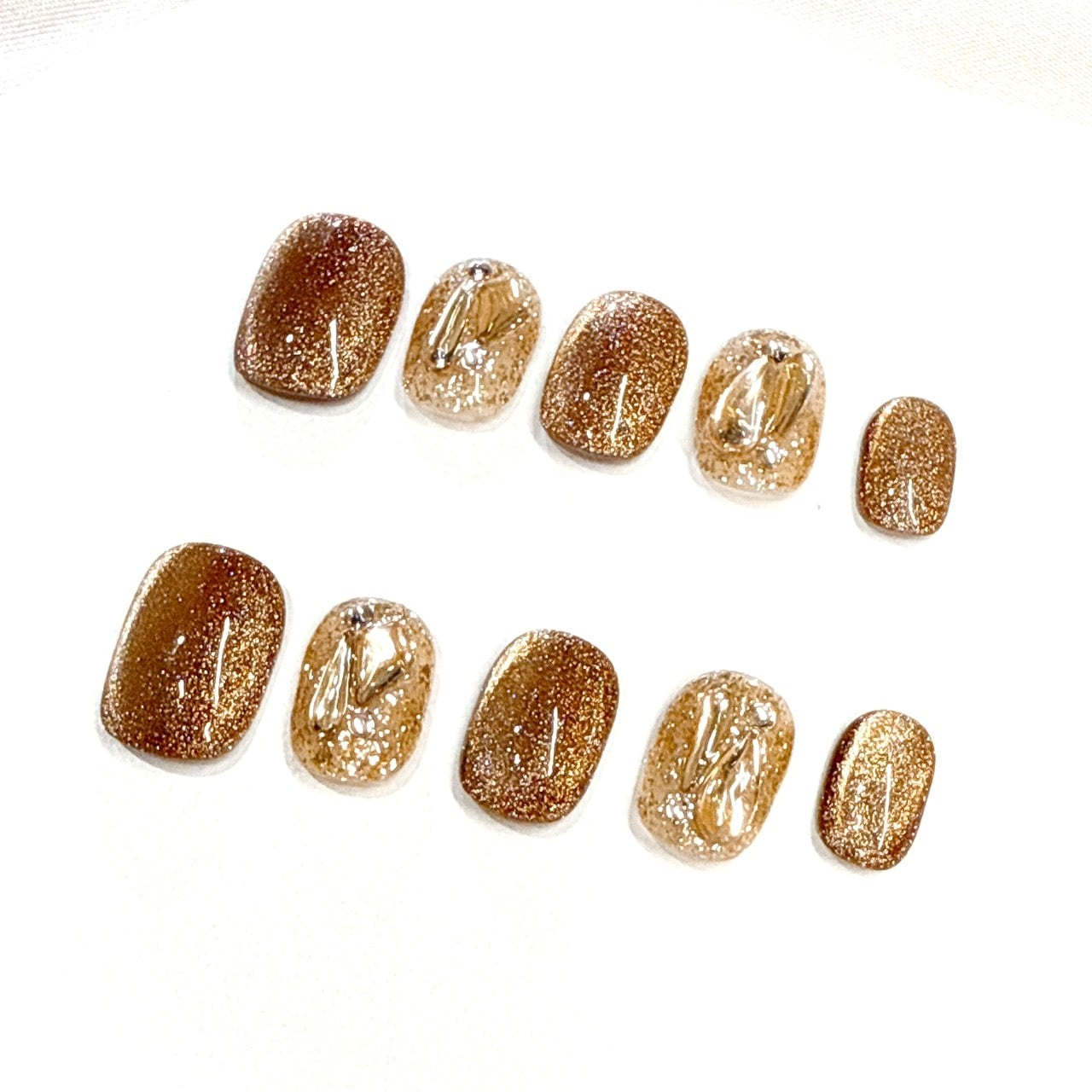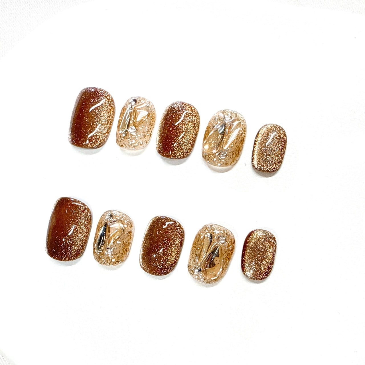 深みのあるゴールドブラウンラメと、クリアベースに閉じ込めたメタリックパーツを組み合わせた洗練ニュアンスネイル。