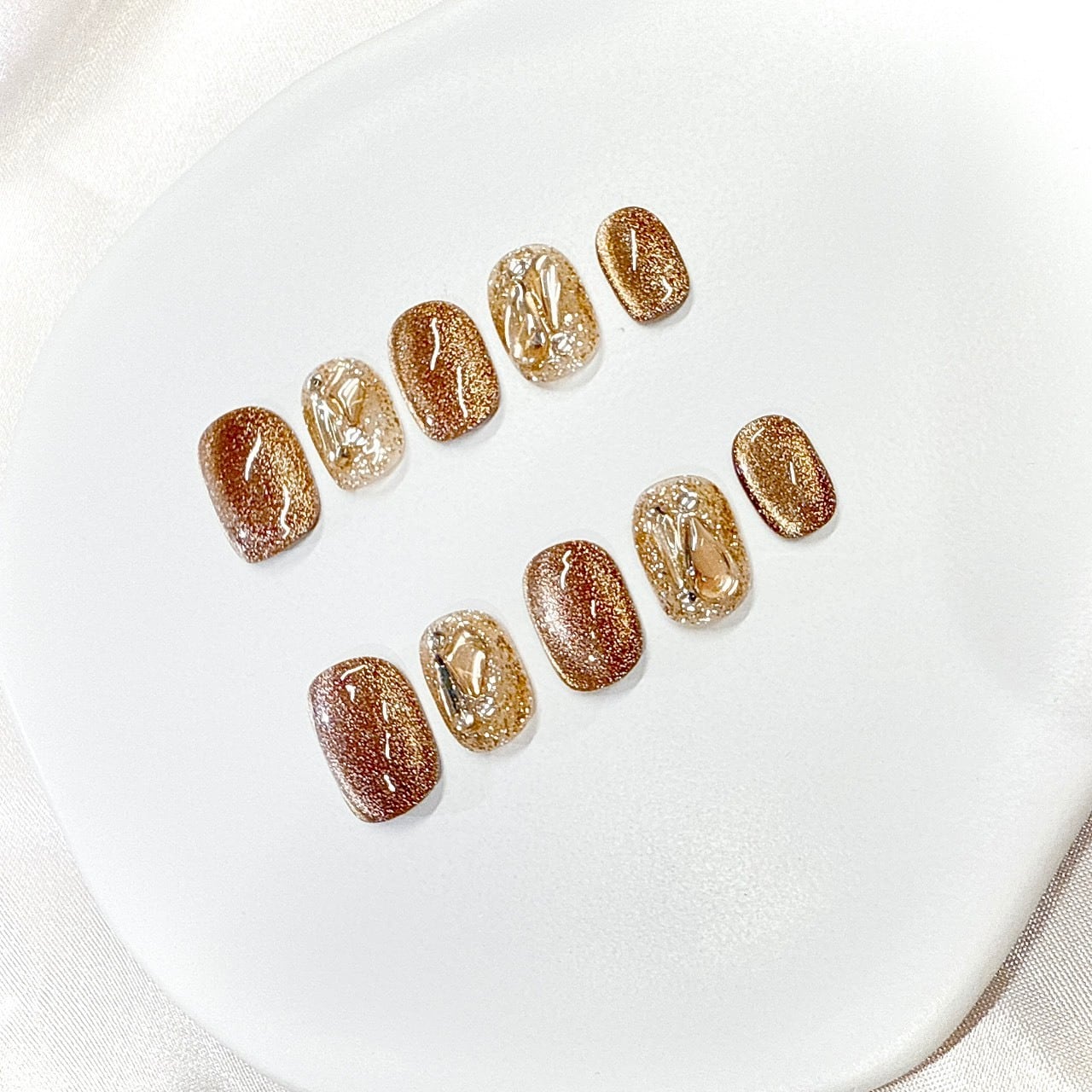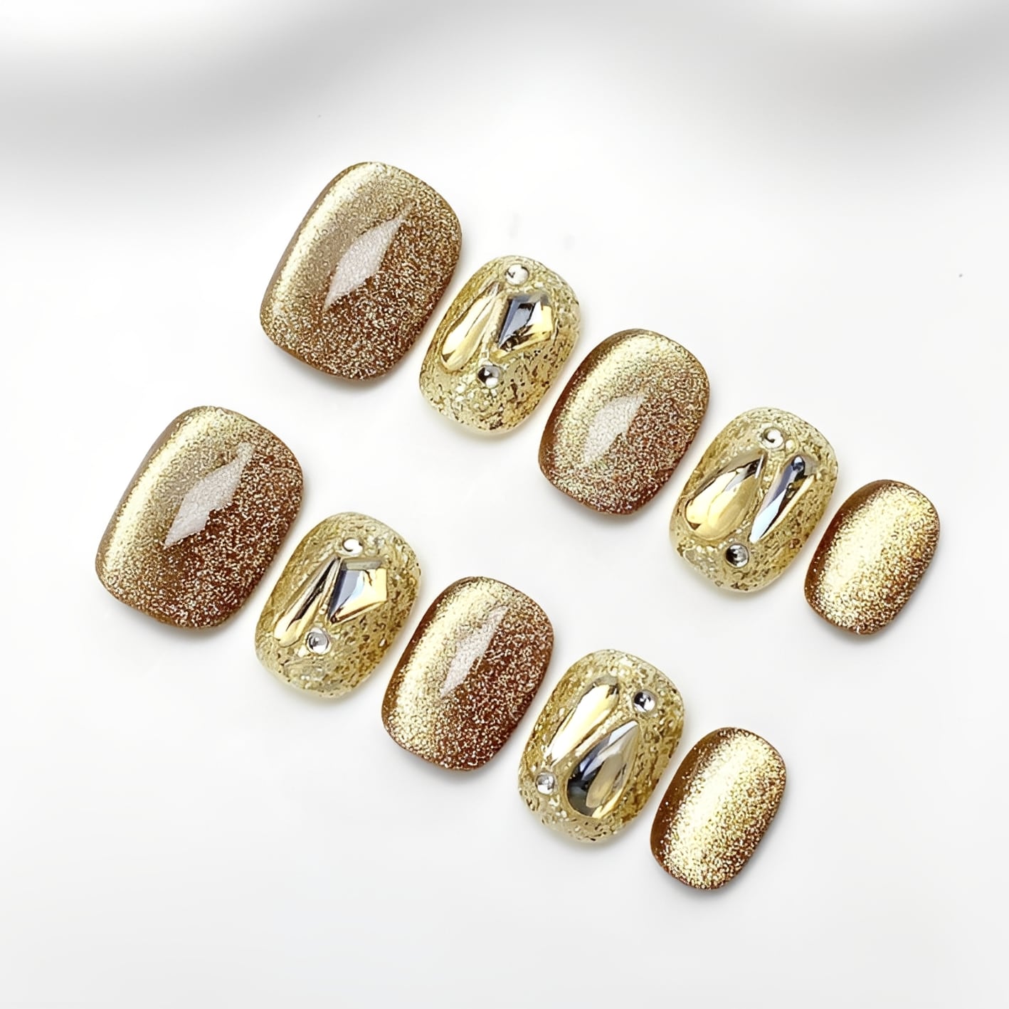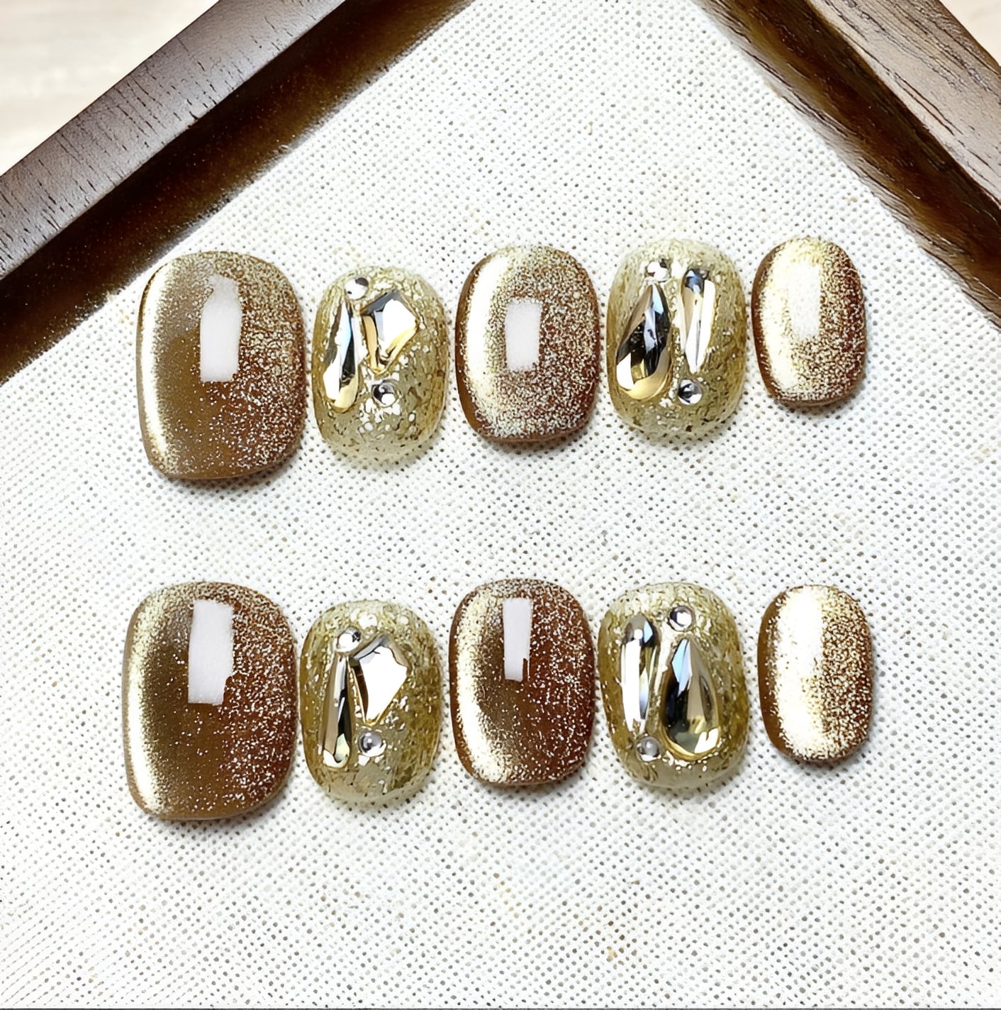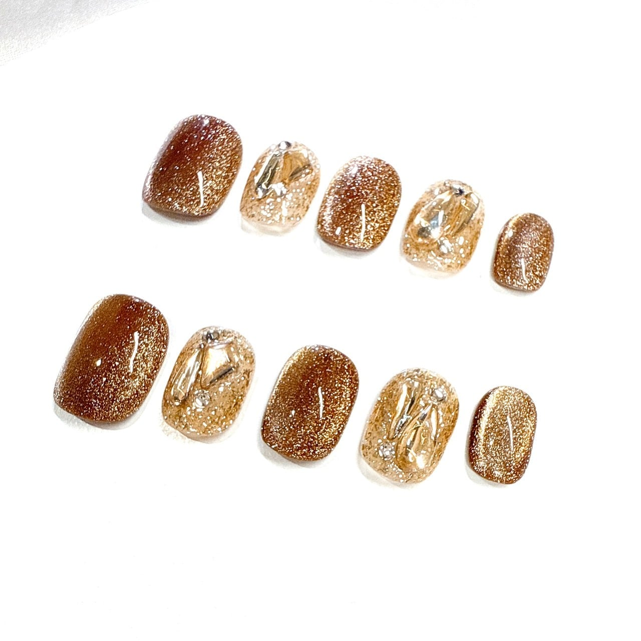 深みのあるゴールドブラウンラメと、クリアベースに閉じ込めたメタリックパーツを組み合わせた洗練ニュアンスネイル。