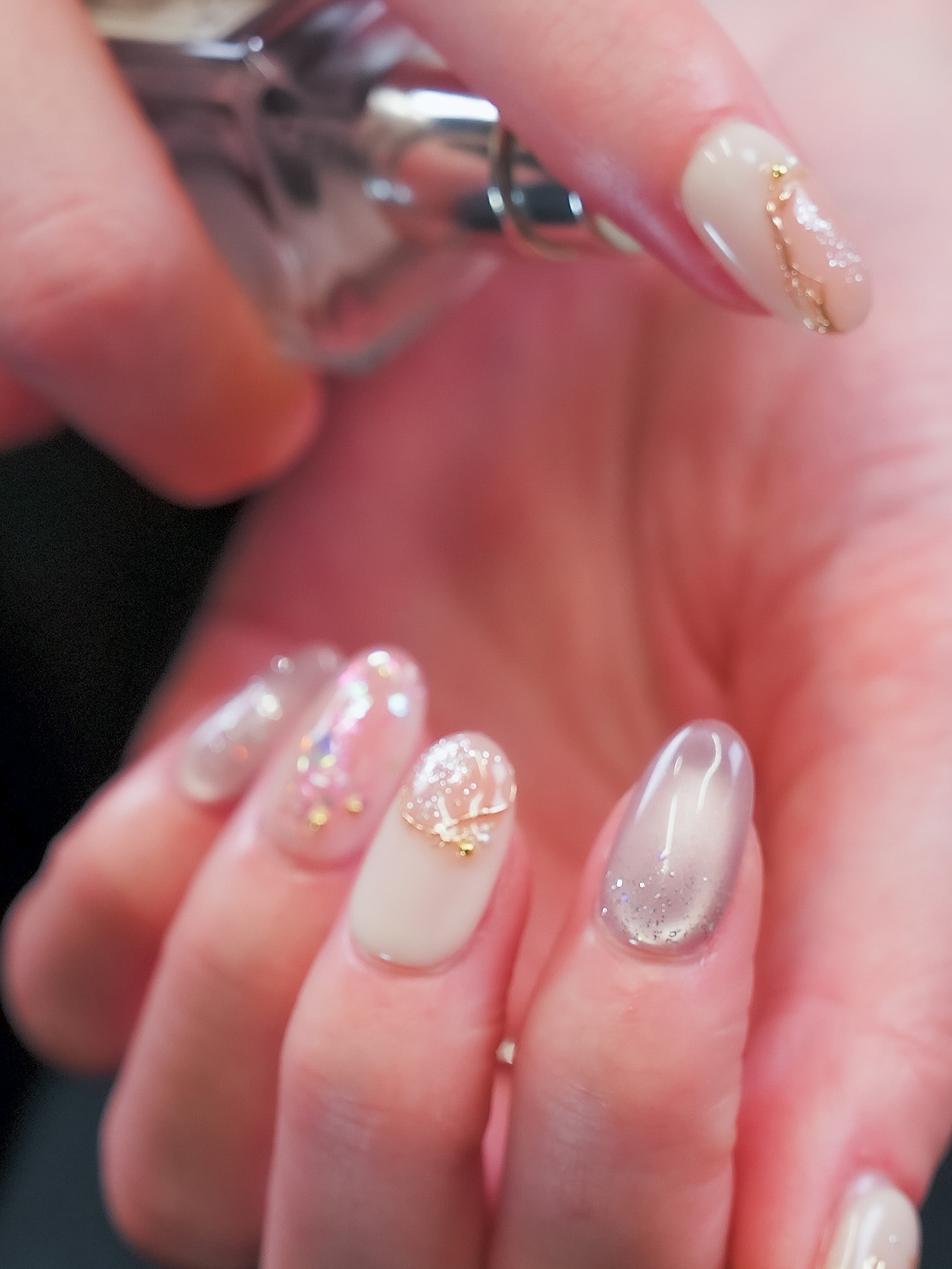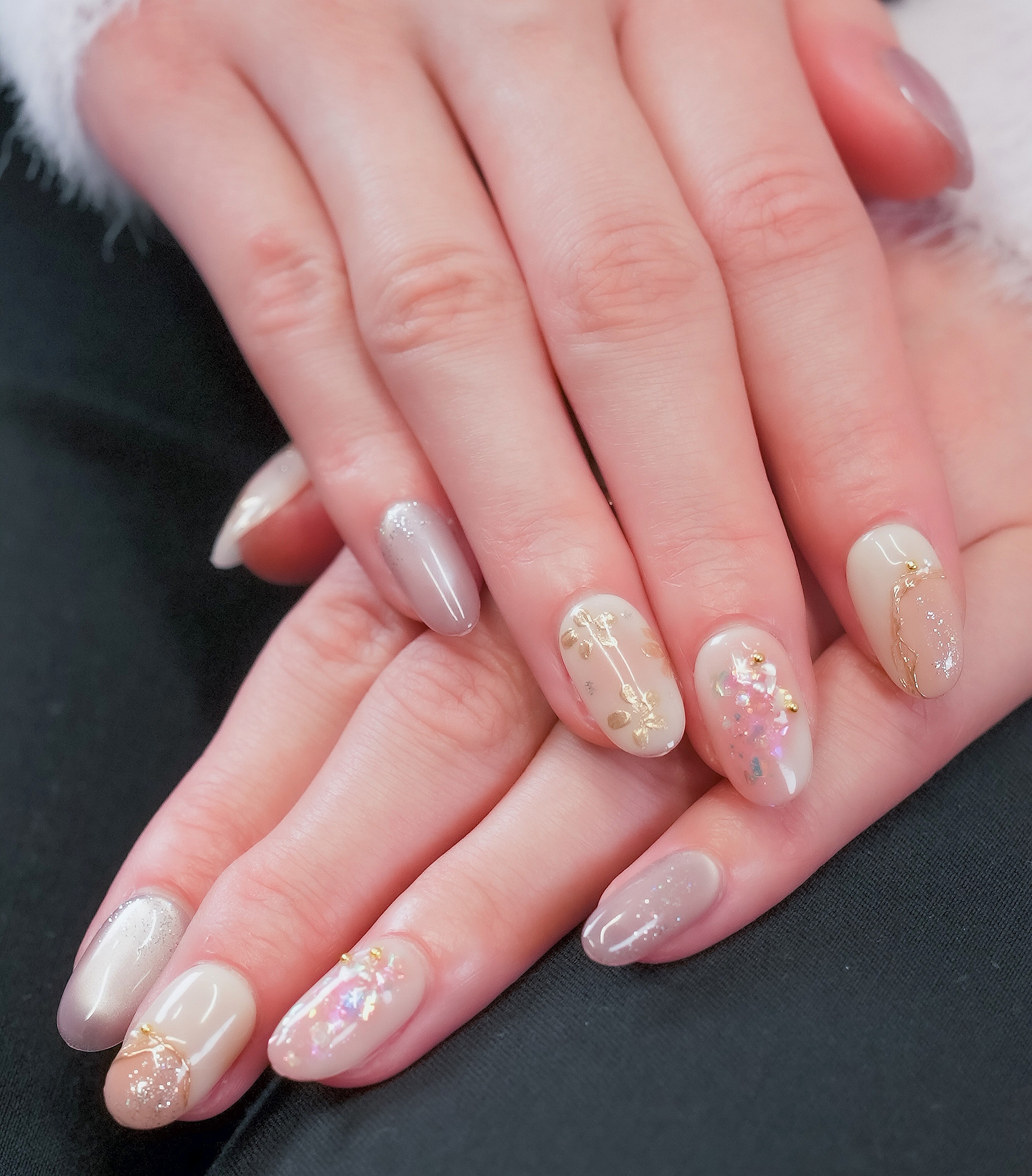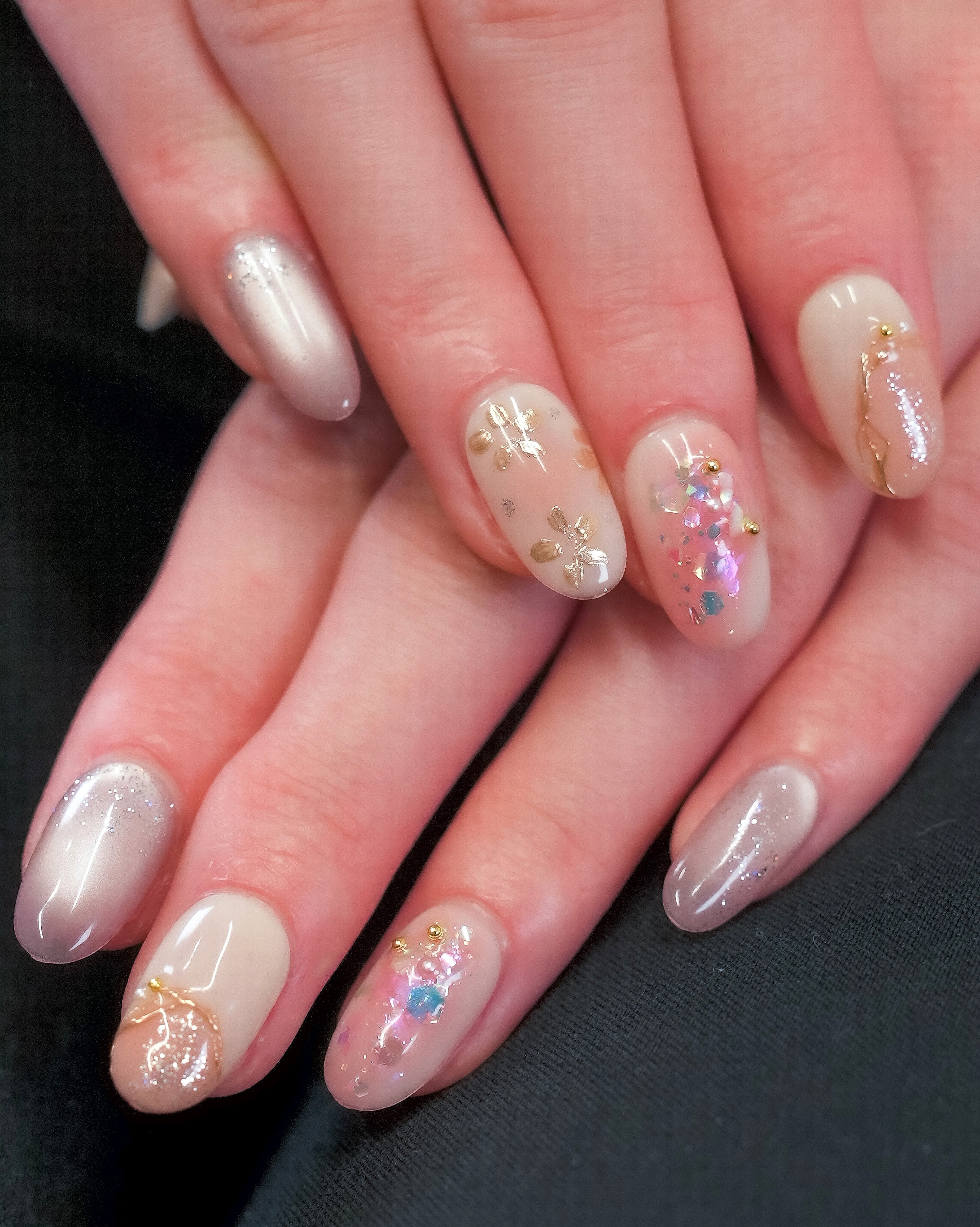 やわらかなベージュとオレンジのグラデーションに、ゴールドフラワーとシェルのきらめきを重ねた華やかデザイン。