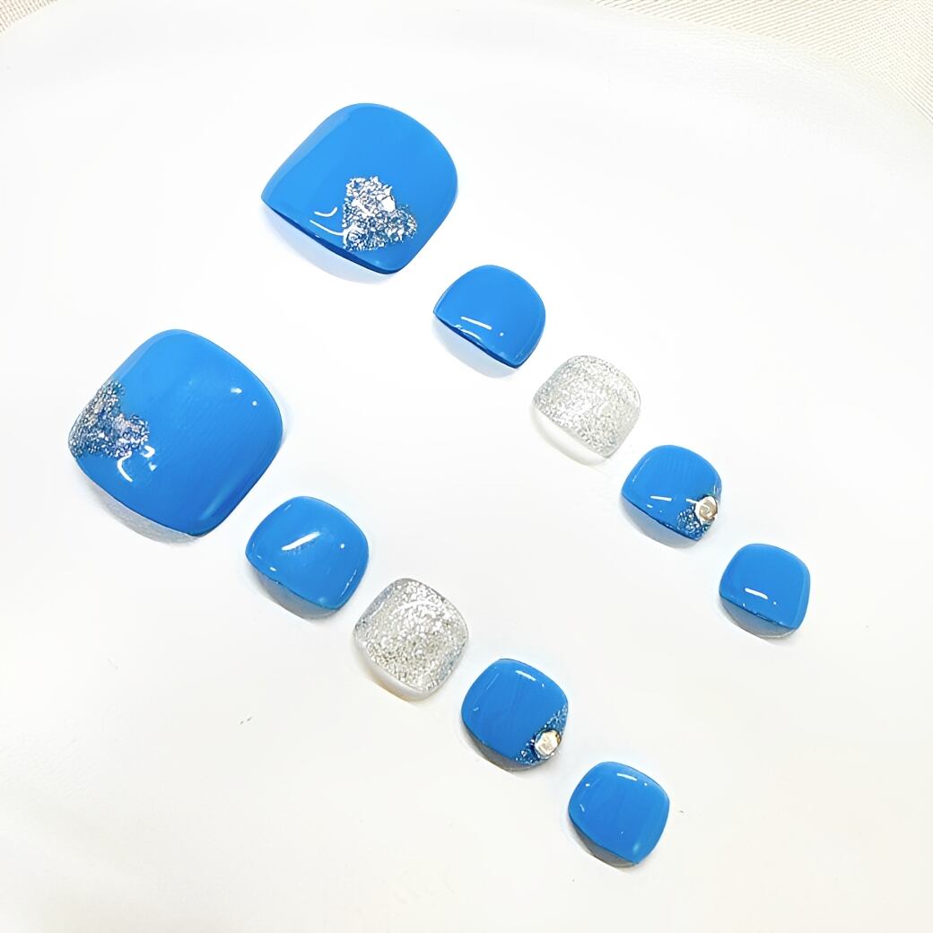 鮮やかなターコイズブルーに、繊細なシルバーラメを合わせた爽やかで華やかなフットネイル。