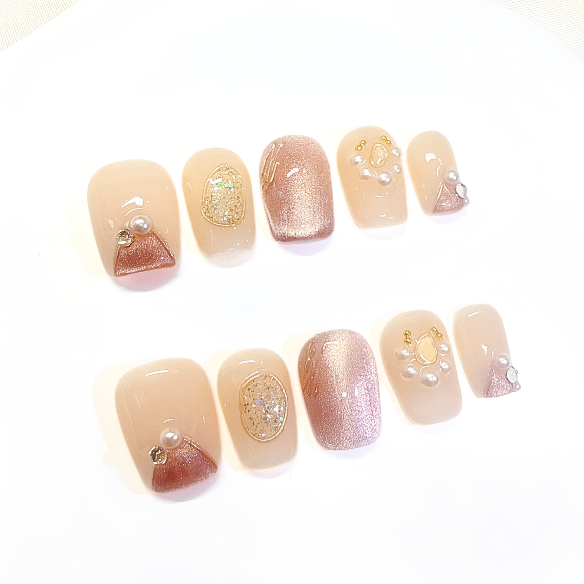 ヌードベージュ×ローズラメ|パールビジューネイル[PM073]